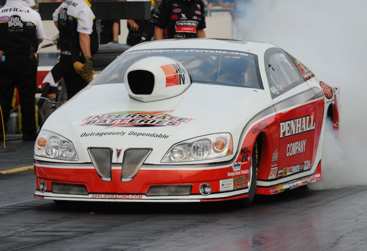 Burgess bettered his top qualifying performance of 5.956 seconds at 249.81 mph in his turbocharged Pro Care Rx 1953 Corvette in the first round of eliminations as he powered past Michael Gullqvist to take the win. Burgess posted the quickest run of the weekend with a 5.926 at 251.91 while Gullqvist’s ’68 Camaro made a hard move to the right at the hit of the throttle and trailed with a 9.268 at 103.23.
