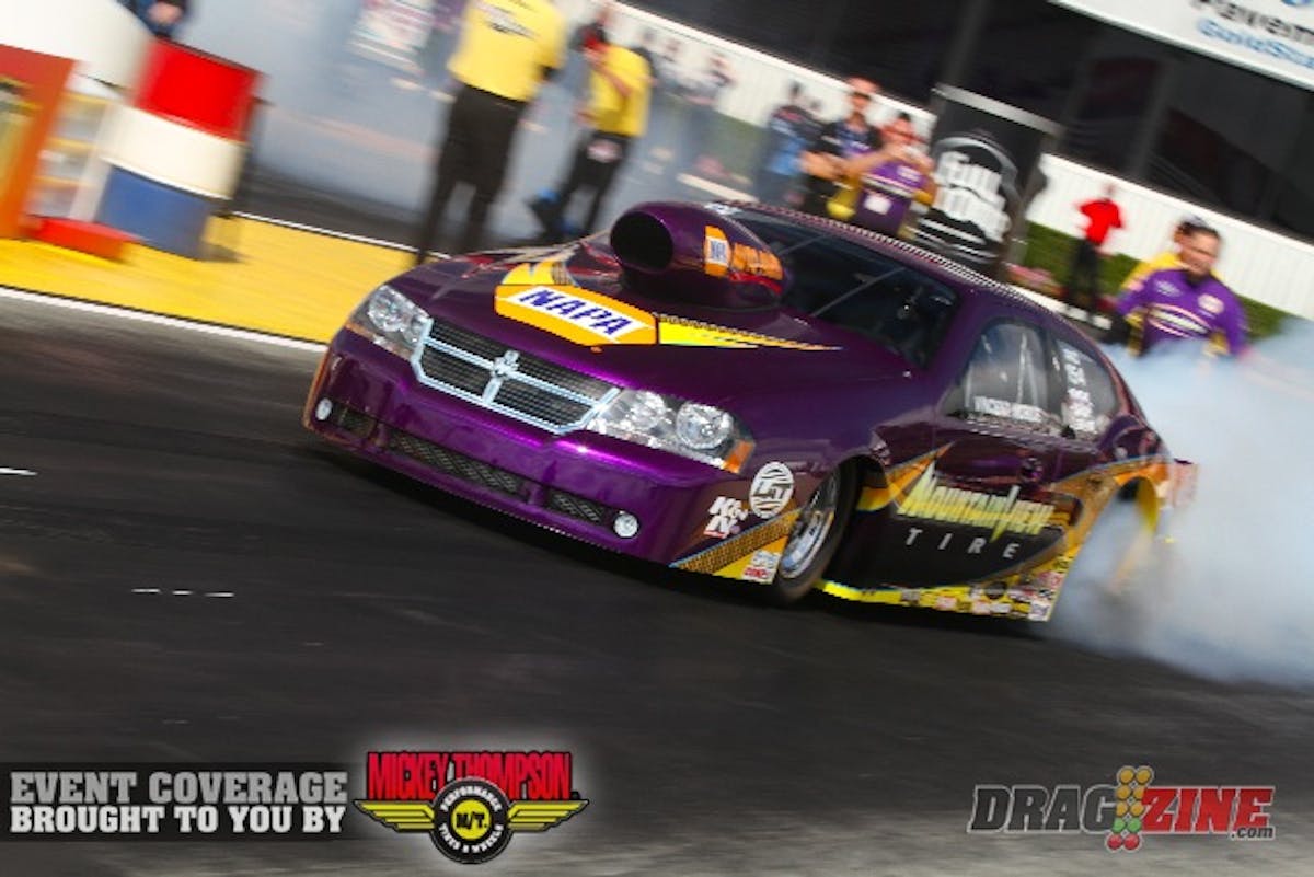 Rookie Vincent Nobile is second with a 6.736 at 205.44 in the Mountain View Tire Dodge Avenger and recent national record-setter Rodger Brogdon was third in his Racers Edge GXP with a 6.736 at 205.32. Series leader Jason Line, a winner of the first two races of the season, is eighth with a 6.749 at 205.01 in his Summit Racing GXP.