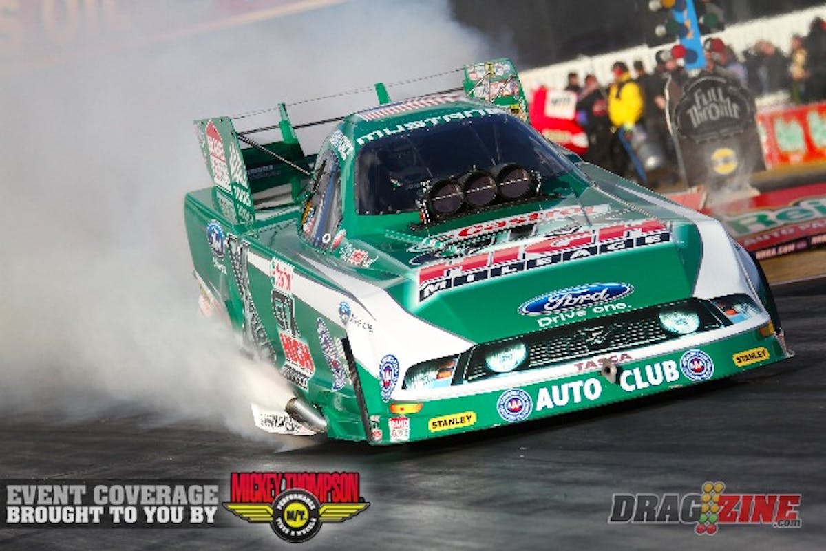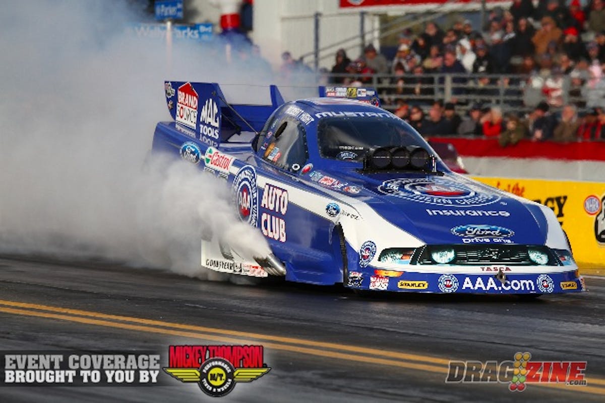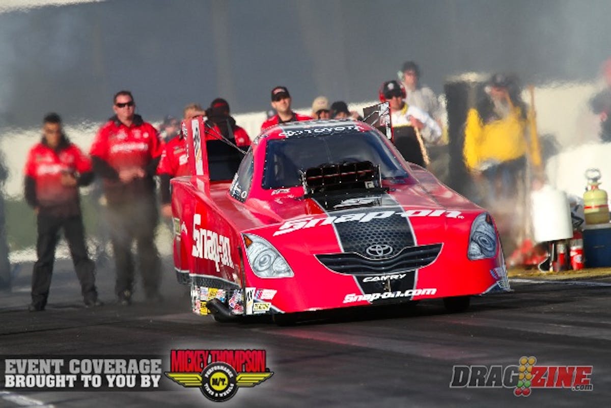 In Funny Car, Cruz Pedregon just edged 15-time world champ John Force for the top spot with a performance of 4.145 at 306.19 in his Snap-on Tools Toyota Camry. Defending event winner Force was second with a 4.169 at 304.25 in his Castrol GTX High-Mileage Ford Mustang.