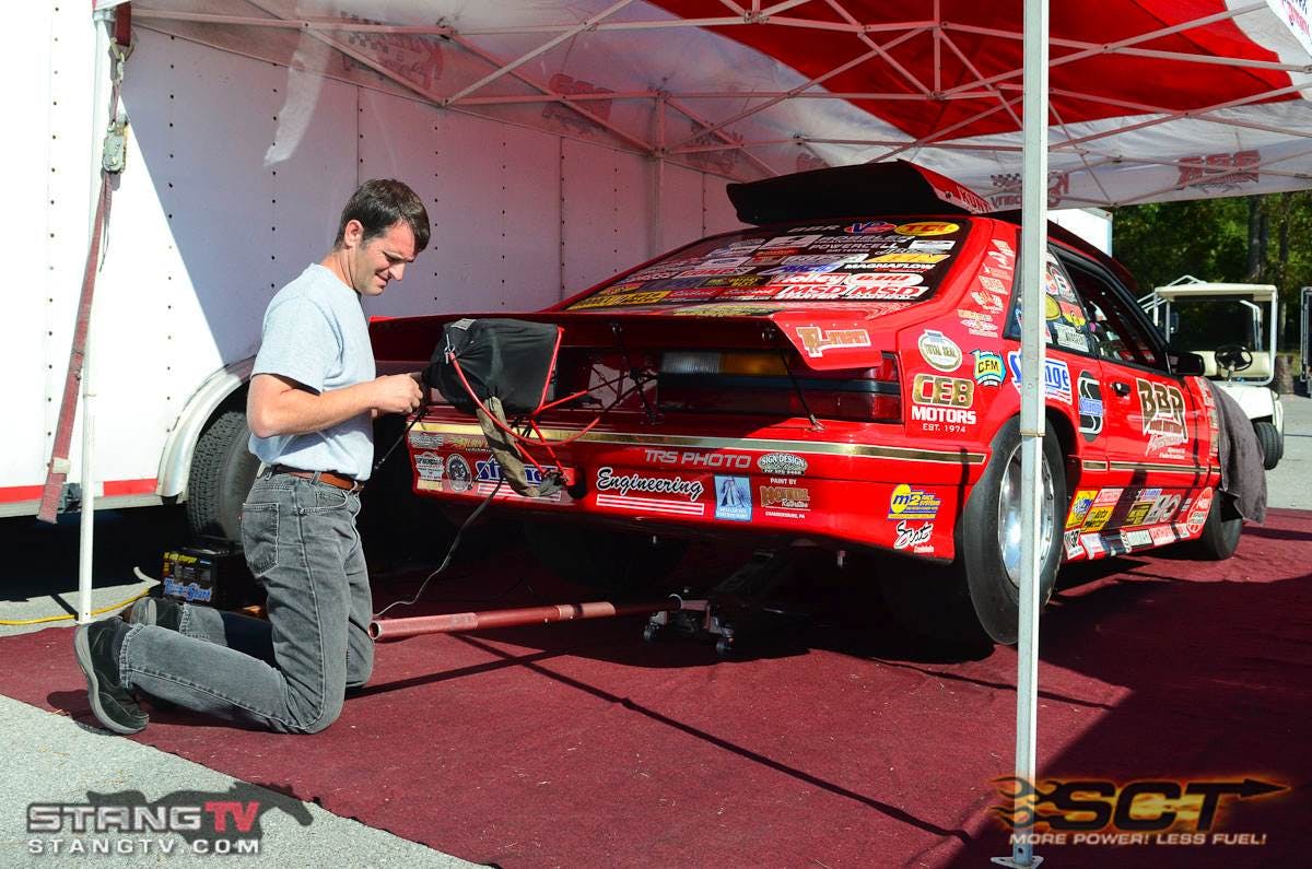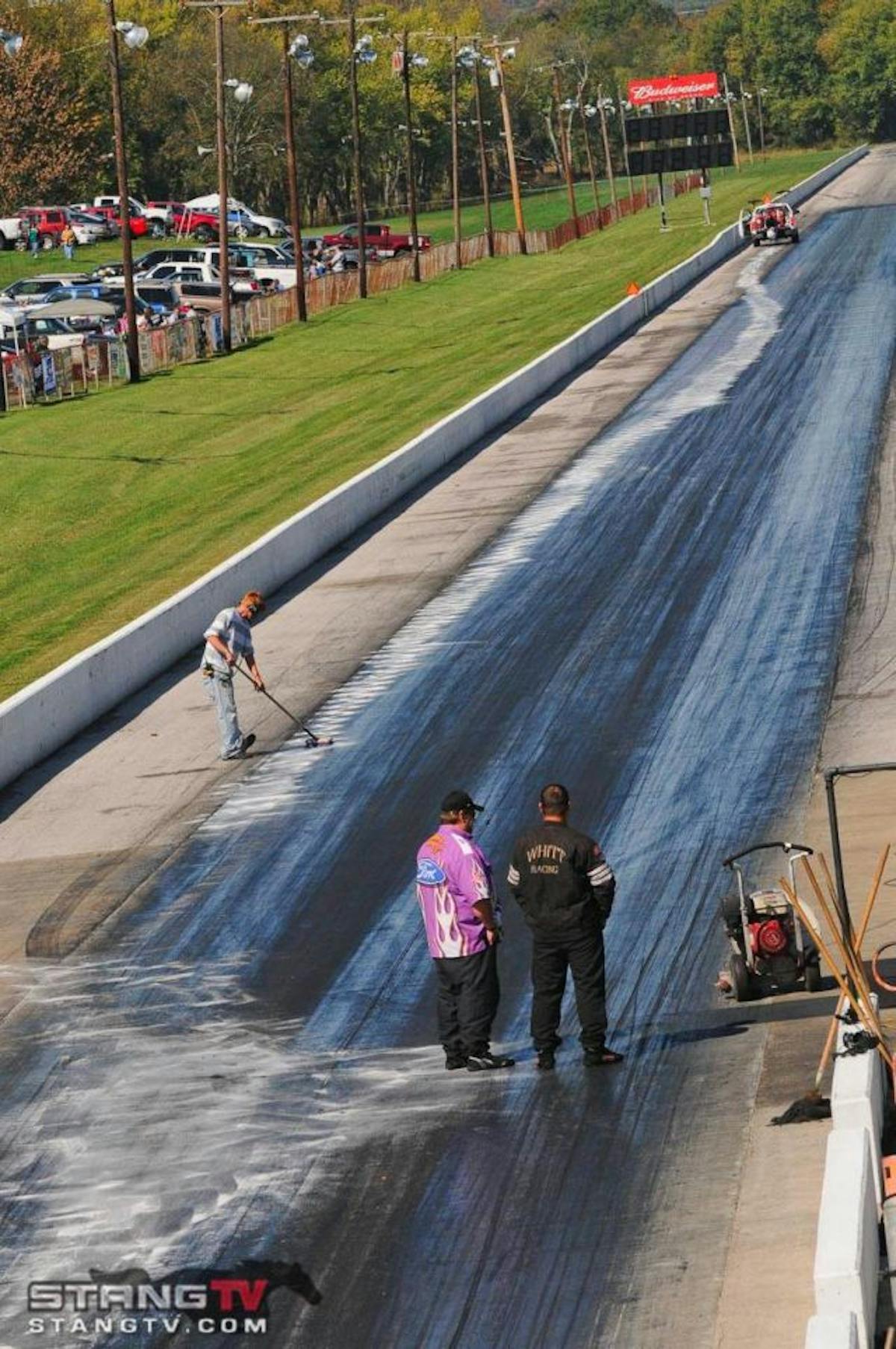 Charlie Booze Jr. was busy prepping his class-leading Mustang this morning for the second session of qualifying. Booze will need a solid qualifying effort and go some rounds on Sunday if he hopes to overtake Don Bowles and his Maverick for the Hot Street title.You'll always find an interesting mix of cars and racers here in Bowling Green, like this '71 Ford Torino known as "Poor Boy".Well, the picture tells the story. We've got oil virtually the entire length of the racing surface, which has put us about an hour behind schedule today.As many as 100 True Street competitors are expected to turn out for the always exciting battle this weekend. A couple of entrants are already knocking on the seven-second zone, and several are in the eight and nine-second range.