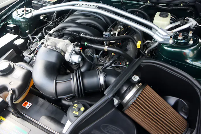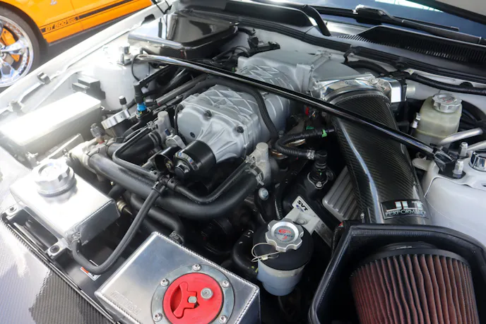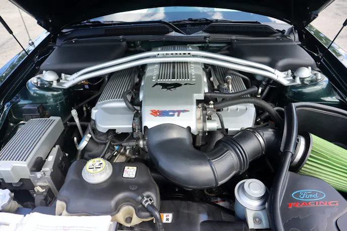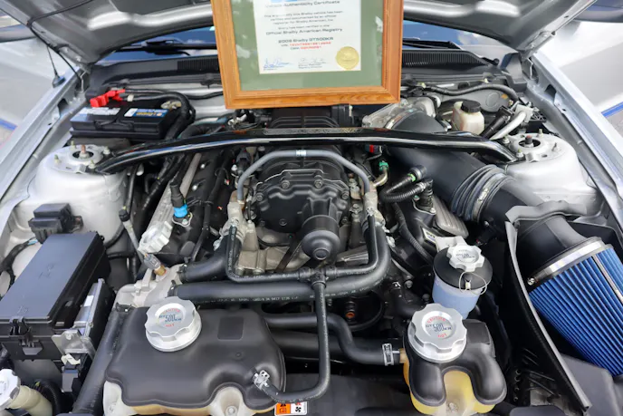 Much to the delight of racers and fans, Ford Performance resurrected the Mustang Cobra Jet in 2008. Amid the S197 platform’s retrotastic era, the factory-prepped drag racer was a sought-after machine. It, however, was not street-legal. The car you see here is Ronald Semple’s street-going 2008 Shelby GT500, made to resemble the straight-line superstar, and we are here for it. Under the hood, its 5.4-liter Modular engine is upgraded with a Trinity TVS supercharger and a JLT cold-air intake, which gives it the extra boost to walk the walk that its exterior talks.
