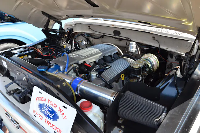 Yeah, Boss 9 as in Boss 429. Need we really say more? This Boss 429 shoved in the F100 of Lee and Lana Smith of Broadway, Virginia is one nasty looking pickup truck. From the legendary Boss 429 up front to a massive tire shoved under the rear tubs out back, this truck screams nasty.