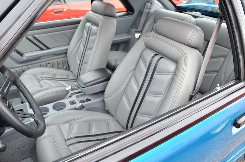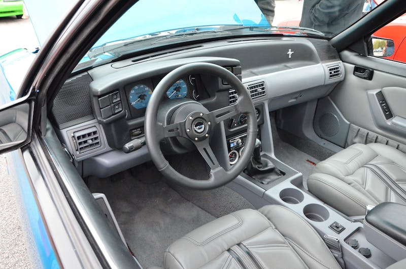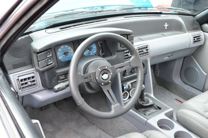While the Vortech-fed 302 Cobra engine is sweet, it's the interior in this car that really sets it apart from the rest. The TMI Opal Grey R1000 sport upholstery mixes the stock look with a modern touch. Tons of other small touches complete it to make one of the sharpest Fox-body interiors we have seen in a good while.