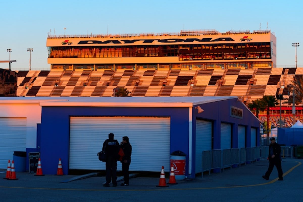 The dawn of a new season: Daytona’s main grandstand is bathed in the glow of the rising sun.