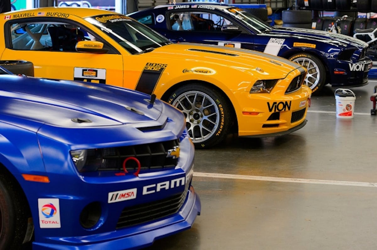 Left: Jim Click Racing brought out their blue #02 Mustang Boss 302R to Daytona for long-time co-drivers Jim Click and Mike McGovern. Center: Early morning sunshine glances the side of the #158 Mustang BOSS 302R in the garages on Wednesday morning before the first practice session. Right:Race-prepped Mustang BOSS 302Rs utilize engines that are essentially the same as that in a street-going BOSS 302. .