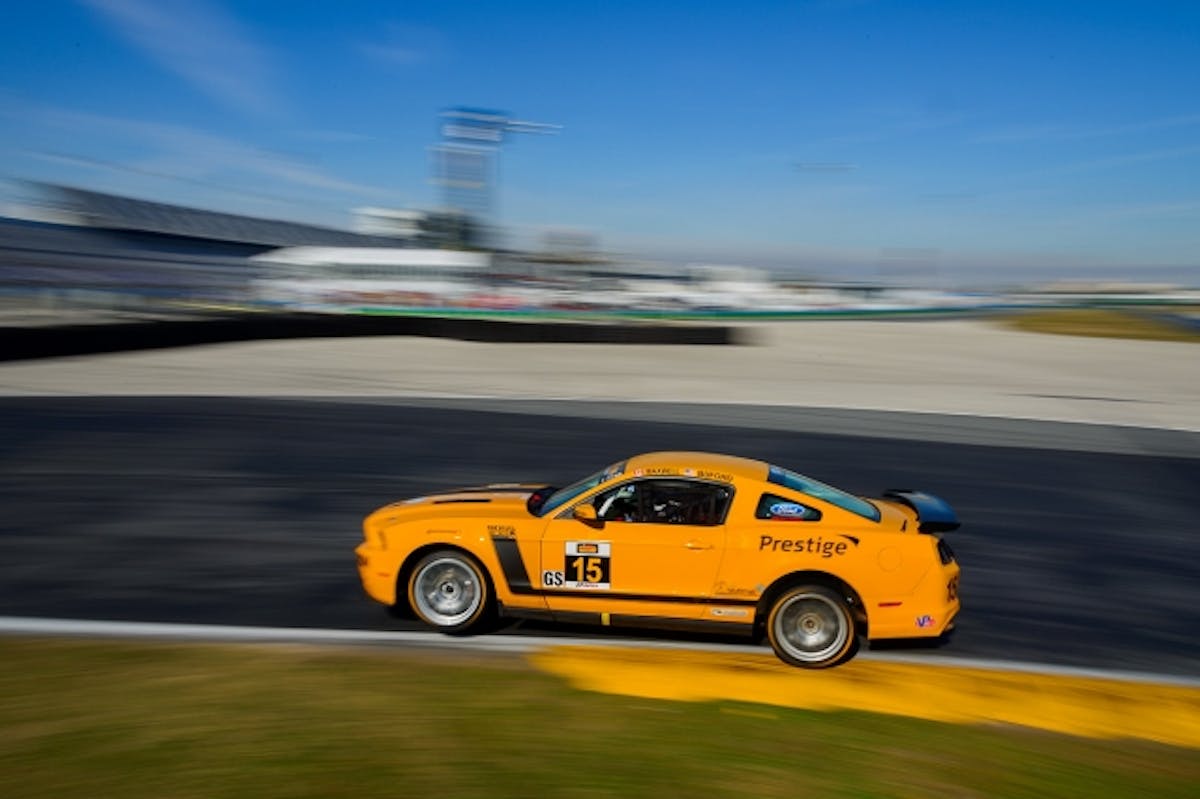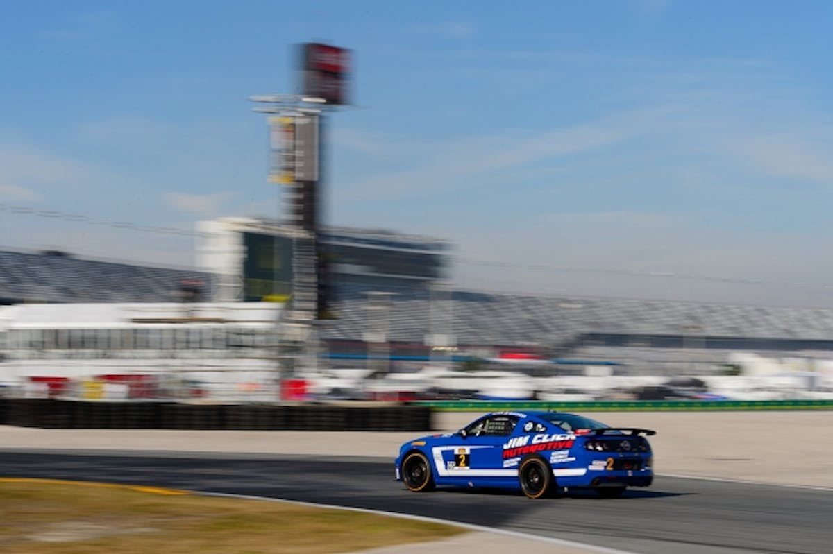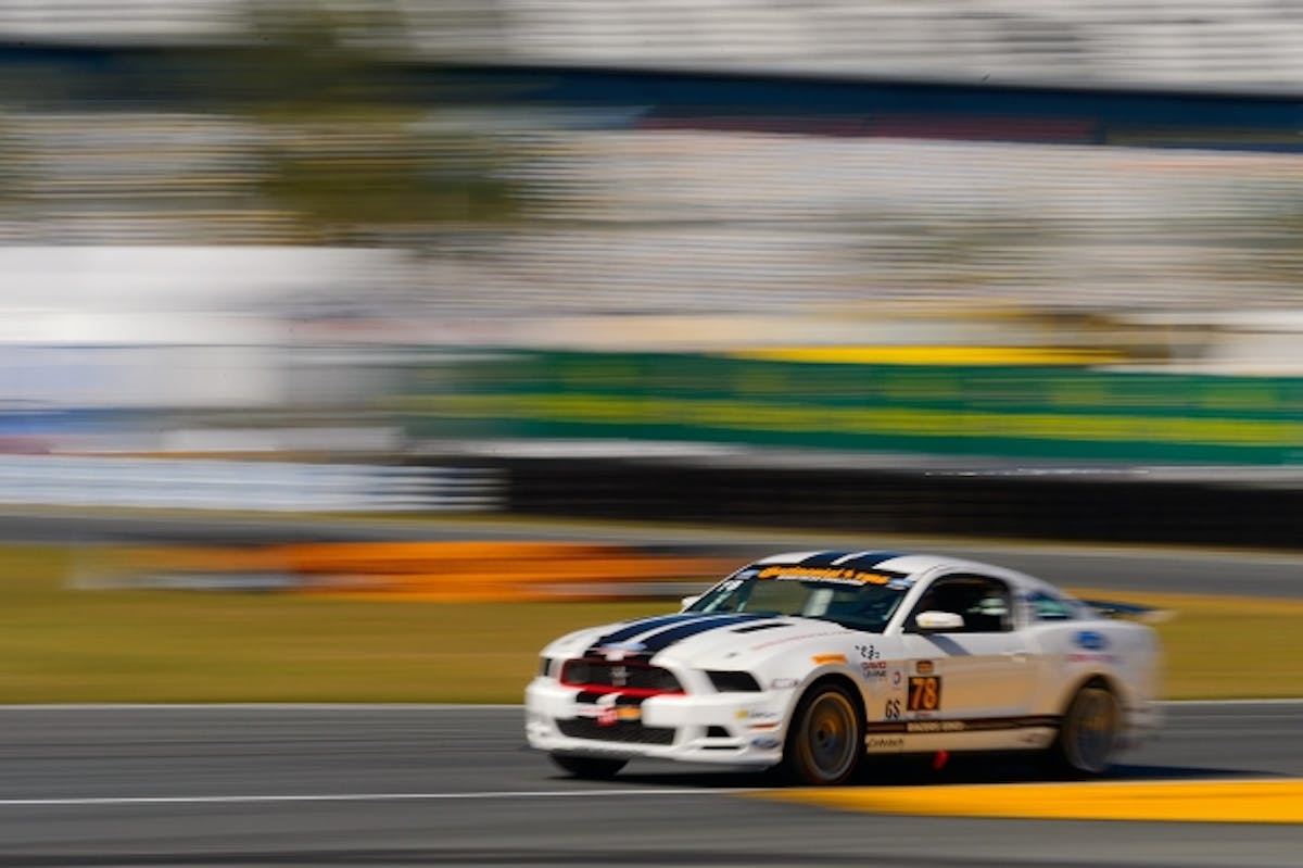 Youngsters Lucas Bize and David Levine shared the #78 Racers Edge Motorsports Mustang BOSS 302R at Daytona, shown here exiting turn three.