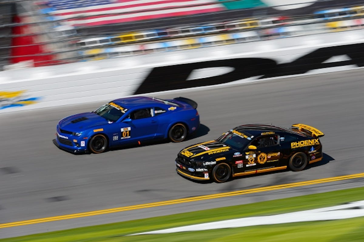 The #32 Phoenix American Racing BOSS 302R powers down Daytona’s front straightaway next to a freshly-built Camaro Z/28.R, with a new 7-liter motor under its hood.