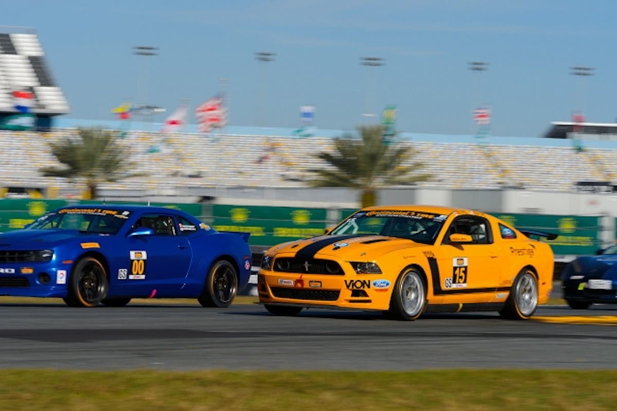 Mustang vs. Camaro: The #15 Multimatic Motorsports Mustang BOSS 302R and #00 CKS Autosport Camaro drag race out of turn three during the warm-up session before Friday afternoon’s race.