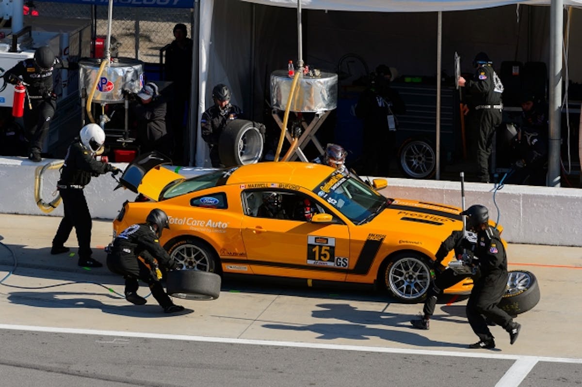 Jade Buford brings his #15 Multimatic Motorsports Mustang BOSS 302R into the pits for fresh tires, fuel, and hand over the reigns to veteran Scott Maxwell.