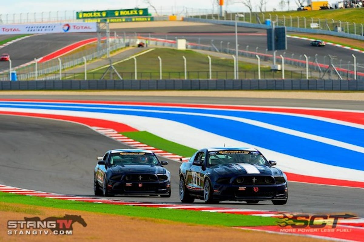 The two Dempsey Racing Mustangs run nose-to-tail entering turn 19 with “The Hill,” Circuit of the Americas’s turn one in the distance.