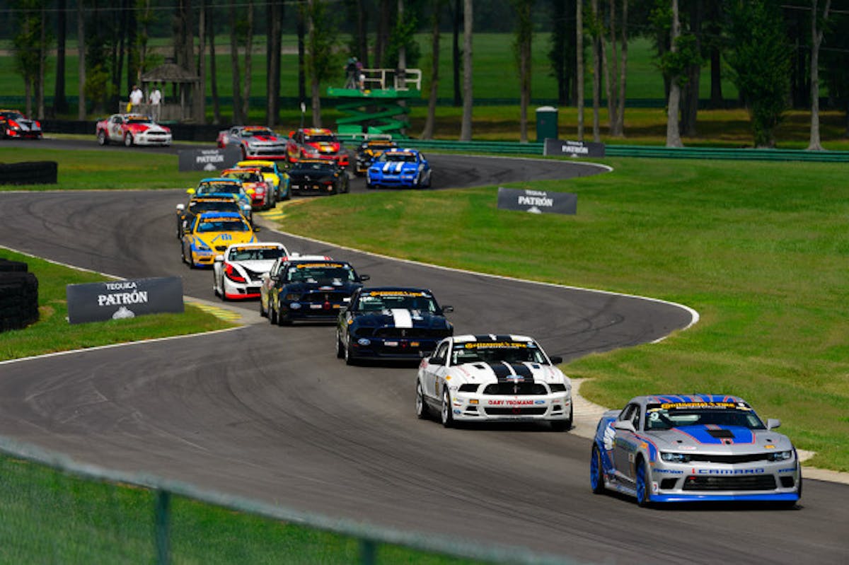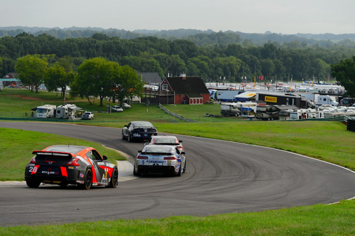 The No. 158 Mustang BOSS 302R is chased by the Stevenson Motorsports Camaro Z/28s and the Tim Bell Racing Nissan 370Z during Friday morning’s practice session at VIR. The track’s paddock can be seen in the background on this humid summer morning.