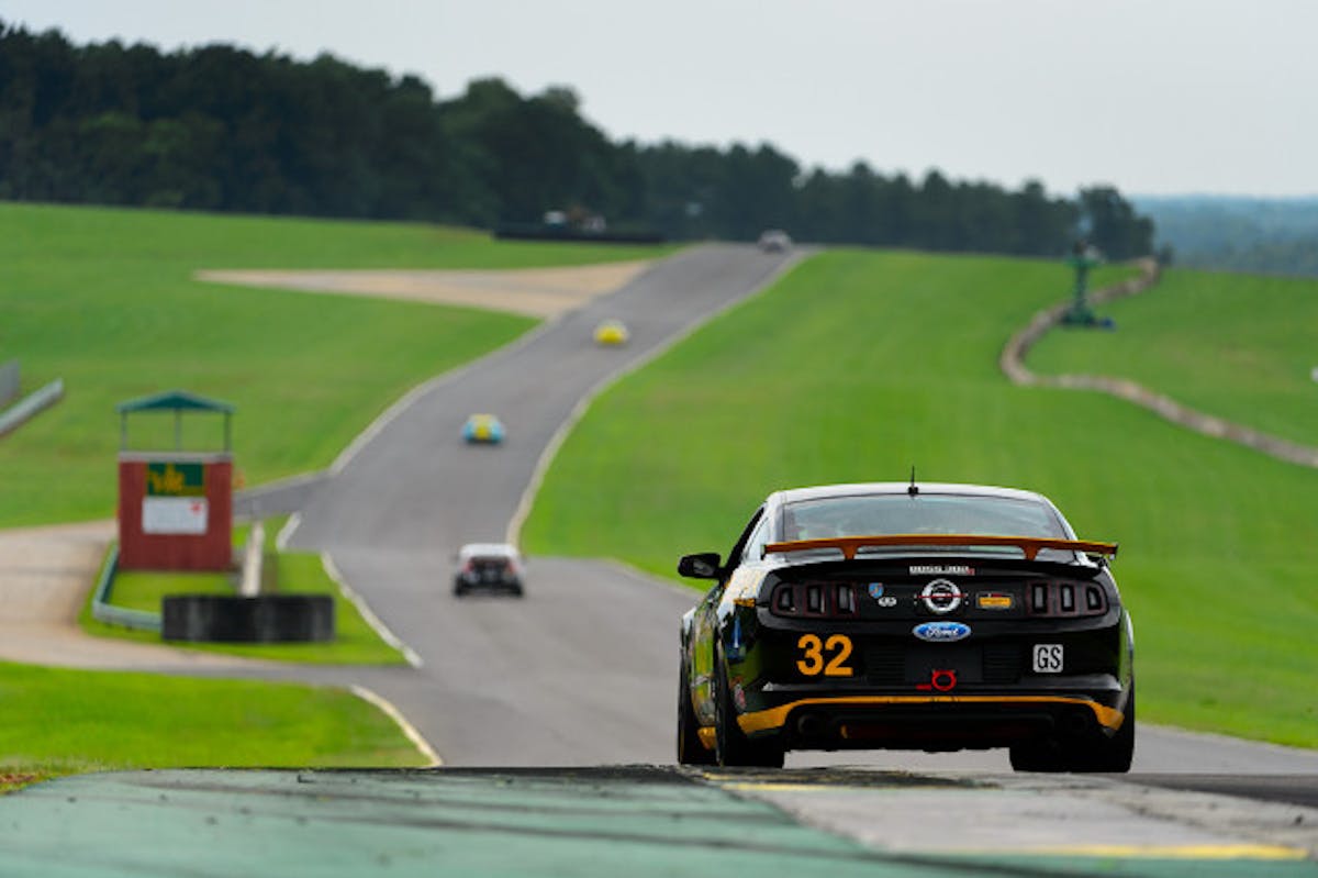Driving his No. 32 Phoenix American Motorsports Mustang BOSS 302R, Andrew Aquilante powers past an ST-class BMW during the closing laps of the Oak Tree Grand Prix at VIR.