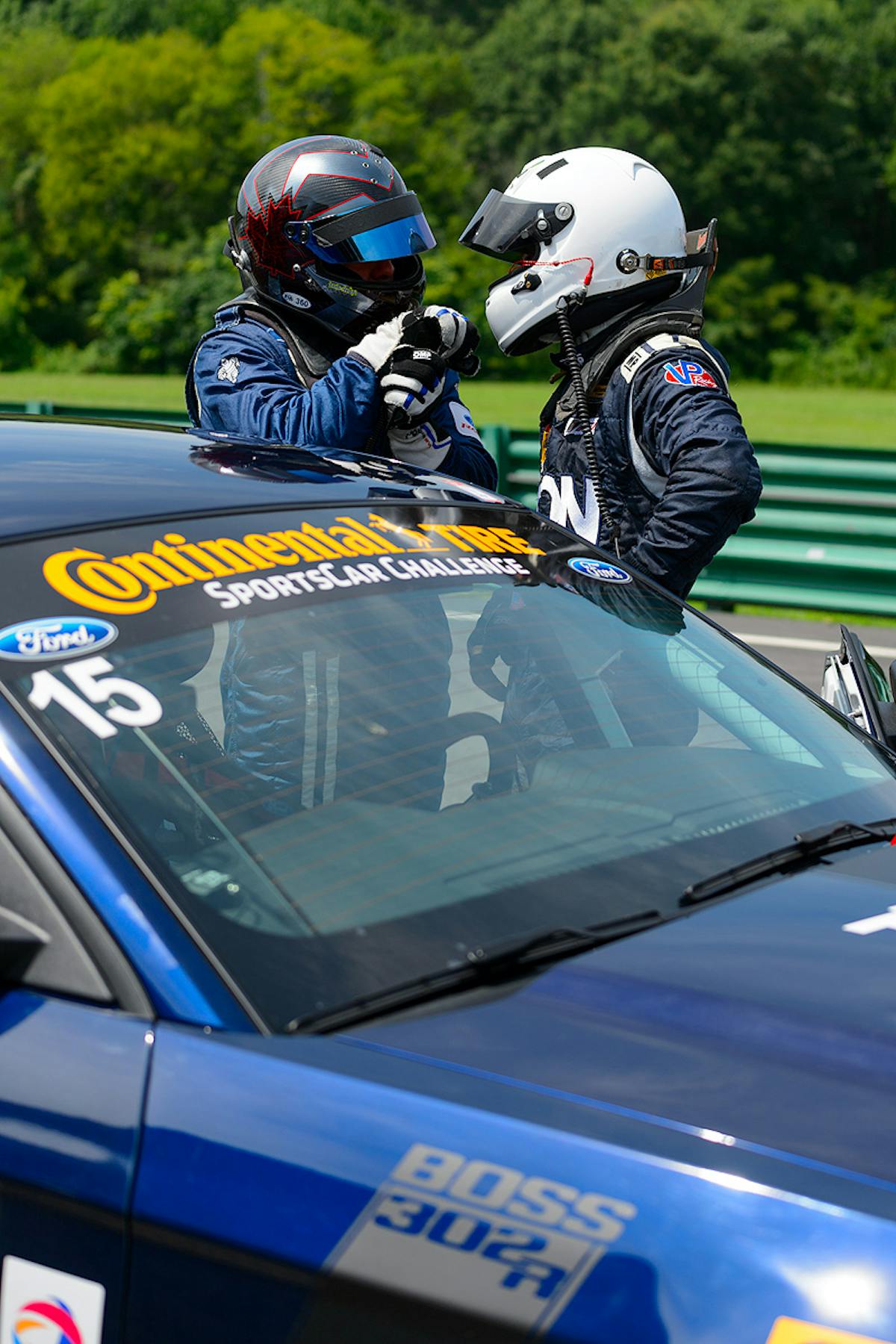 Scott Maxwell (left) and Jade Buford (right) briefly discuss the handling of the No. 15 Multimaitc Motorsports Mustang BOSS 302R during a test session on Thursday afternoon at VIR.