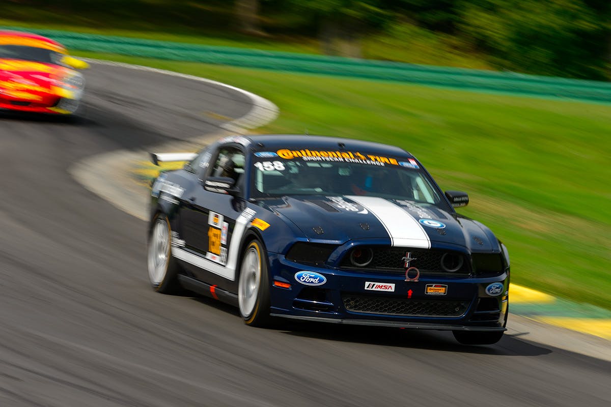 Billy Johnson powers out of turn six at VIR driving the No. 158 Mustang BOSS 302R he shared with Ian James.