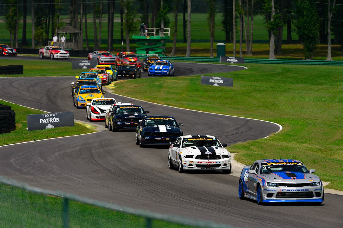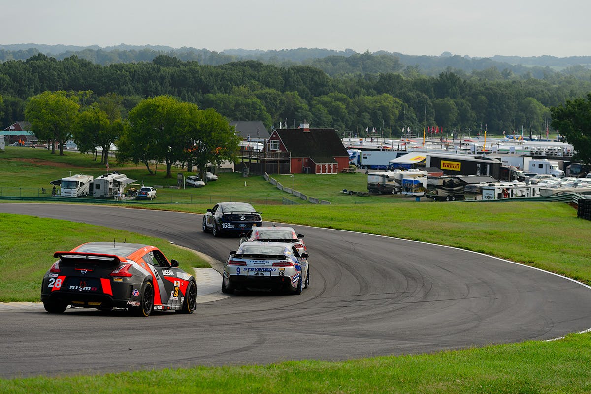 The No. 158 Mustang BOSS 302R is chased by the Stevenson Motorsports Camaro Z/28s and the Tim Bell Racing Nissan 370Z during Friday morning’s practice session at VIR. The track’s paddock can be seen in the background on this humid summer morning.