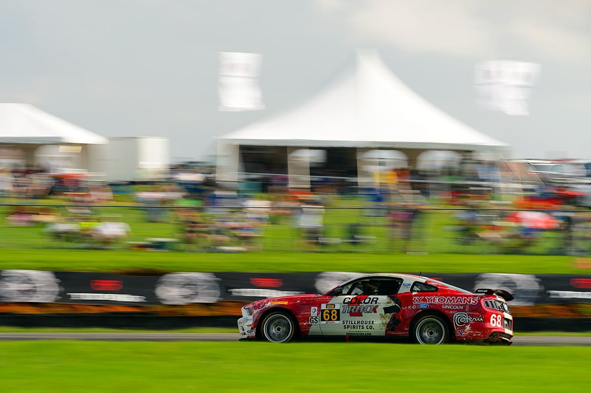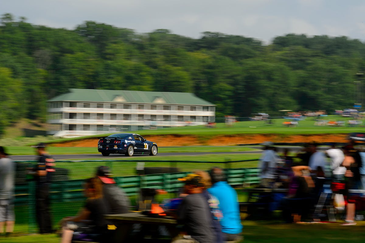 The bruised No. 68 Mustang BOSS 302R from racer’s edge Motorsports roars past the crowd gathered on the hillside at turn four. Drivers Ricardo Flores and Cory Lewis finished the race 11th after starting 20th.