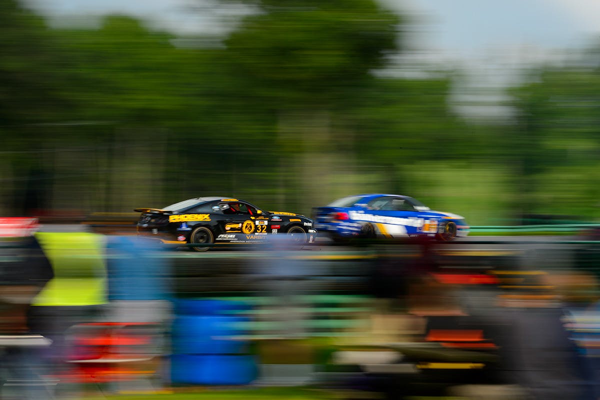Driving his No. 32 Phoenix American Motorsports Mustang BOSS 302R, Andrew Aquilante powers past an ST-class BMW during the closing laps of the Oak Tree Grand Prix at VIR.