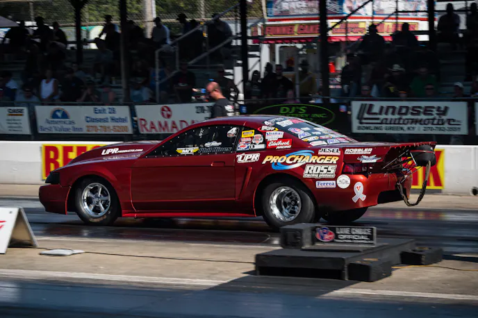 During the Street Outlaw eliminations, a 275 radial category for vehicles with a single power-adder, DiDonato took on Phil Hines and his ProCharged ’01 Mustang which couldn’t hold off DiDonato’s turbocharged ‘stang in the opposing lane.