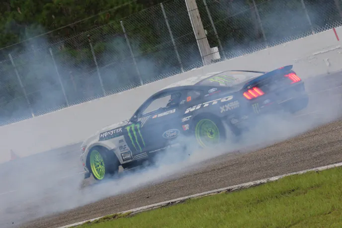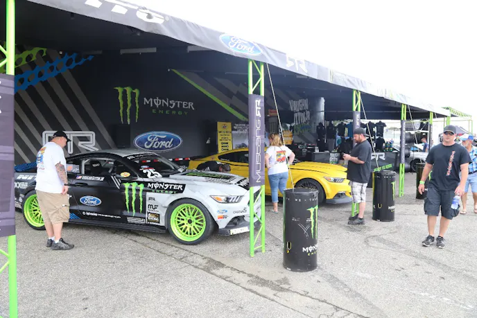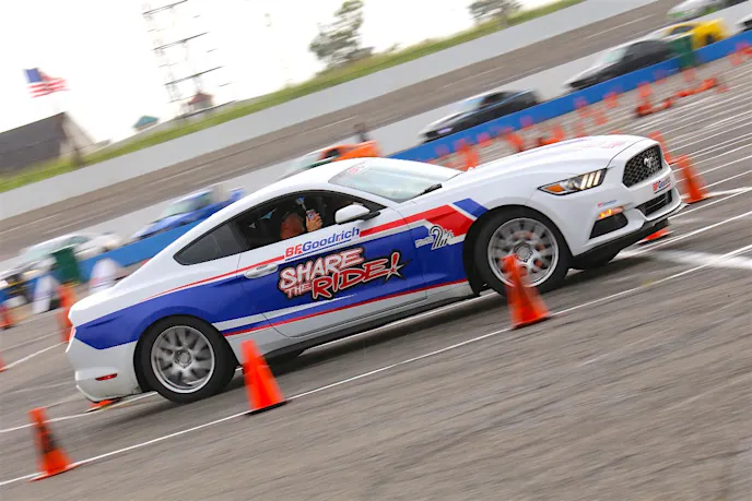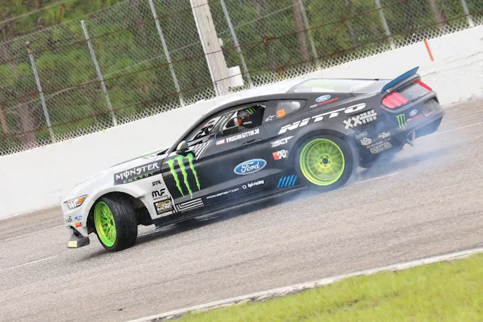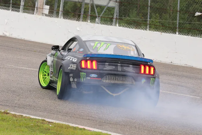 Speaking of challenging and entertaining, Ultimate Fun Haver and Formula Drift champ, Vaughn Gittin Jr. was on hand to drift his Mustang RTR demo car around the oval track. Vaughn had no trouble sliding on the wet pavement, but he really had to work its supercharged Coyote to produce a bit of smoke on the wet surface.