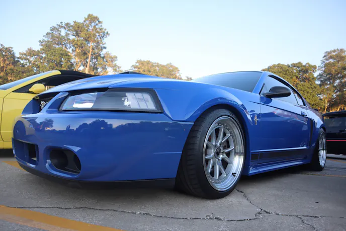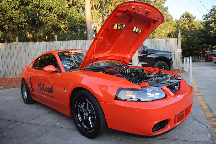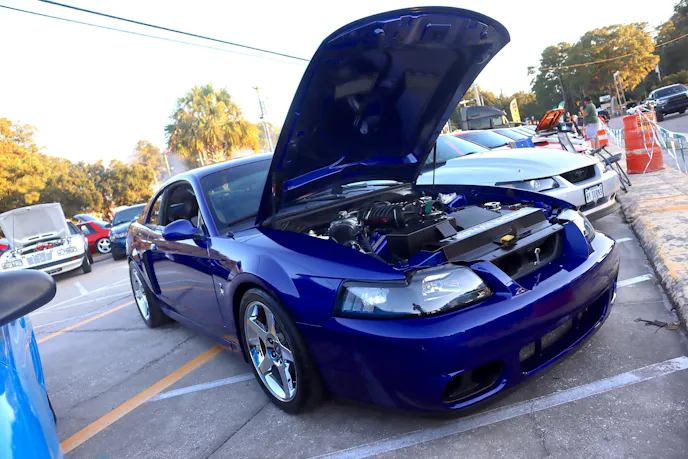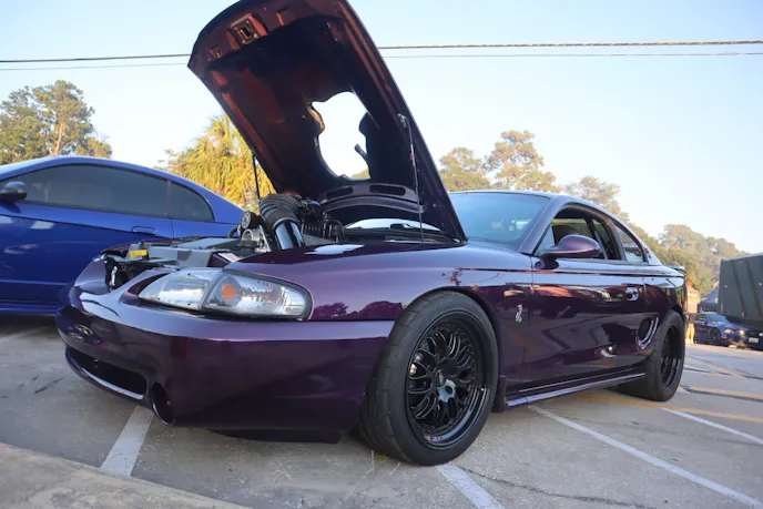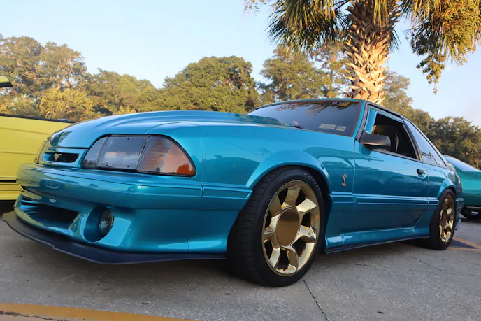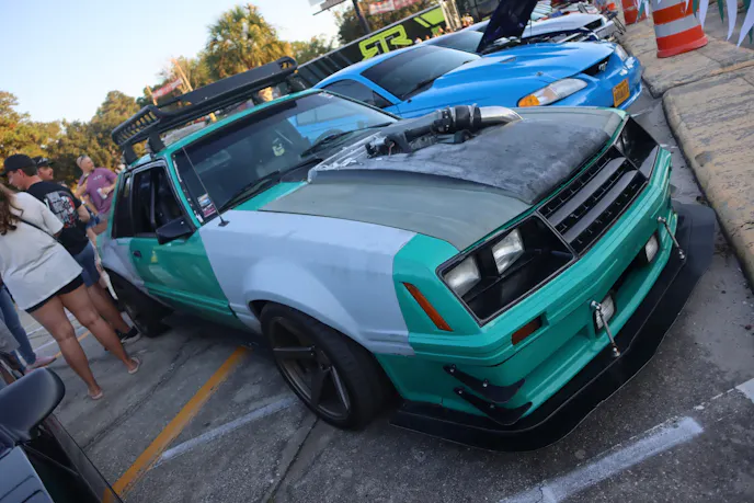 While the S550-and-newer crowd is prominent during Mustang Week, Retro Meet shows deference to the classics. There were plenty of sweet Fox, SN-95, and New Edge rides on display at Suck Bang Blow. Among them was this ProCharged, Gen 3 Coyote-swapped Fox. With skinnies up front and big meats out back, this notchback looked ready to race.