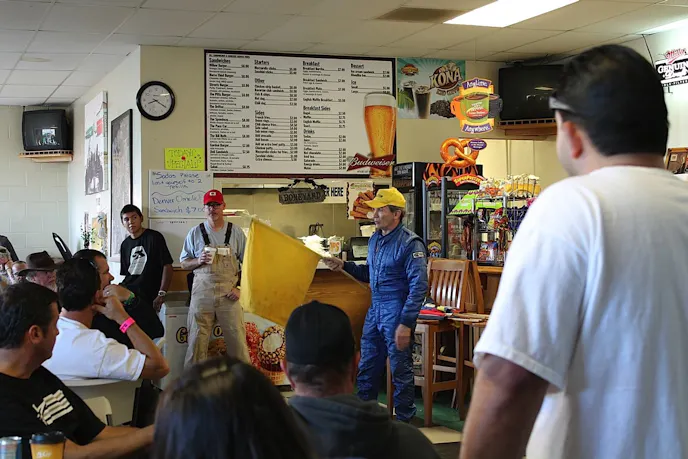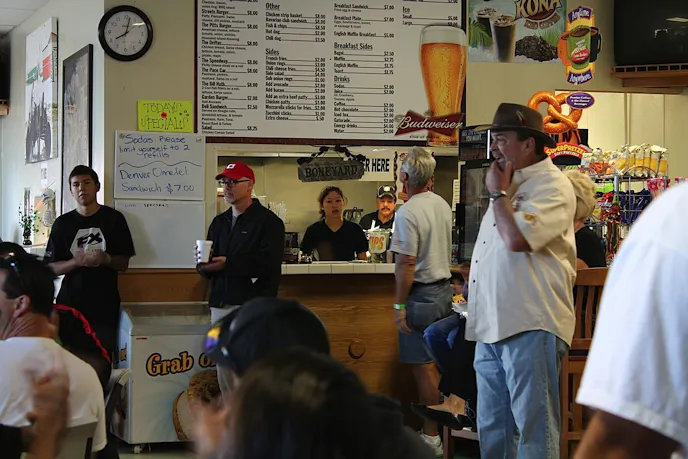 At at 8 o’clock on Saturday morning, everyone who races is required to attend the mandatory driver’s meeting. We were there this past October for the weekend to talk with everyone, and to share our experience with you. The crowd gathered in the restaurant where Jim and his wife, Cherie, spend much of their day at the registration table, or assisting people with questions and concerns.