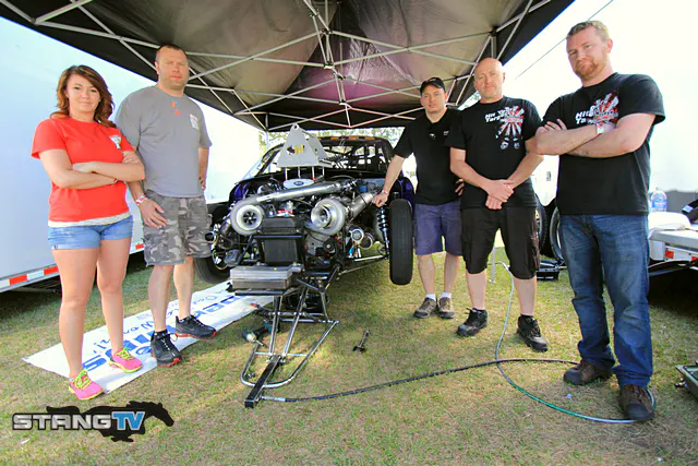 Tyler Eichhorn is debuting a new car for Coyote Stock this weekend using a Ram clutch and G Force T5 transmission. Tyler struggled hooking the car testing and found a broken strut. A quick call to Mark Menscer got them fixed up and a new pair will be here in the morning to get them back on track. Demon Motorsports did the fabrication and chassis. From left to right, Ari Birchfield, Tyler, Tim and Christina Eichhorn.