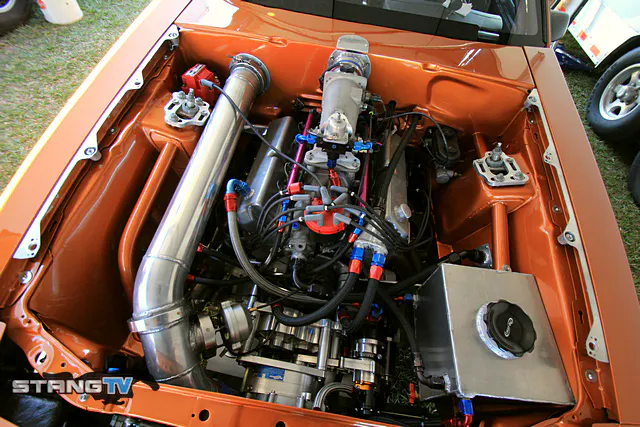 Brad Gussler owns this ECO Boost powered world record holding Mustang with a 10.58 at 129. He runs a SCT tuned CPE built engine fed by a Precision 60MM turbo in the Watson Racing prepped chassis. The trans and converter is from Circle D and the car rolls on Race Star wheels with stopping power from Aerospace 4 wheel disc brakes. Mountune Performance is also a major sponsor of Gussler's racing efforts.