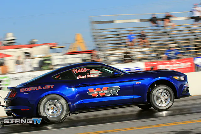 We stopped by Watson Racing this morning and spoke with Sales and Marketing Manager John Phillips. The team has their brand new, first off the 2016 line Cobra Jet on the property and has already ran a 8.40 at 161, the fastest legal Stock Eliminator pass to date. Watson Racing is the shop Ford tagged to build the Cobra Jet cars and they also offer assorted parts and chassis components for the late model cars from the S197 bodies forward. Company owner Chuck Watson Sr. handles driving duties and he is also entered in True Street and will be running in the grudge night after qualifying. Phillips shown with Chuck Watson Jr. on the right.