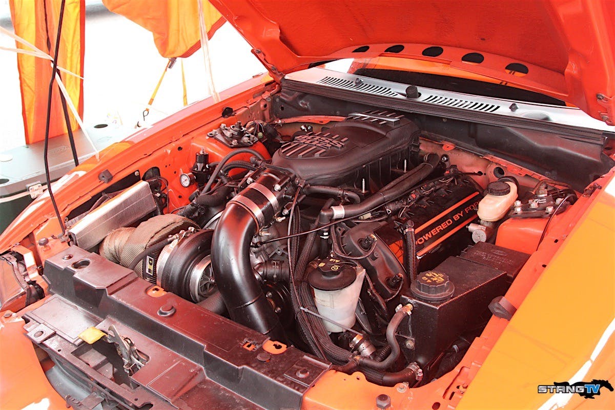 Travis Akins is running the Turbo Coyote Shootout this weekend with a 2012 5.0 powered by a built MPS short block with stock heads tuned by Justin Jordan remotely at Bear Lynch's Dyno Pro and a single front mount Borg Warner from Forced Induction turbo backed by a TH 400 trans and PTC Converter. The hot and cold side of the turbo system was fabricated by PTS Fab Performance Systems. The car sits on Weld 77 series wheels with full UPR Suspension with QA1 Coilover shocks out front and Vikings out back. He is active duty Airforce stationed in and formerly had the car set up for road course racing and took two year built to make the conversion. This is the first race for the car which was just finished and his first NMRA event and showed up with no testing coming in but ran an 9.8 at 155 on Thursday.