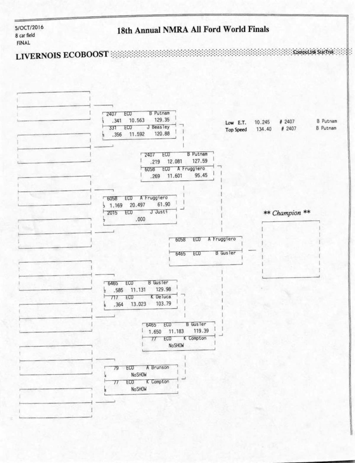 Troy Messamore was the QA1 True Street winner this weekend in a field of 135 cars. Bowling Green always brings a good True Street contingent. He put up an 8.210 and a 7.900 scoring an 8.055 average for his efforts.The VP Racing Fuels Street Outlaw class sure had some excitement this weekend with Joel Greathouse setting a new class record with a 4.347 and making it to the finals to meet Phil Hines. Greathouse had a single in the semis but slowed to a 5.20 at 106 on the pass. For his part Phil Hines qualified fourth and put up a 4.488 at 163 against Charlie Cooper, who had just pulled a long wheelstand and lost his door after coming down hard near the 330 mark in the quarterfinals. He went red against Hines, setting up the final with Greathouse. Hines and Greathouse were the last two pairs down tonight in what turned out to be an anticlimactic final with Greathouse rolling the beams in Charlie Hull’s car, as the transbrake would not hold the car. Hines wheelied himself in the final, slowing to a 6.62 at 71 MPH and earning the season championship with the event win.Edelbrock Renegade had some great racing today with a fourteen car field. Adam Arndt was the number two qualifier behind Aaron Bates. Both entries were consistent all day in eliminations, though Bates would have lane choice in the final round with a 7.94. Arndt would leave first with an .054 reaction time. Bates scored a .099 and that was enough with his ET advantage to score the win with a 7.447 at 179 to Arndt’s 7.519 at 184.04.The Procharger Coyote Modified final came down to number two qualifier Joe Guertin and number four Haley James with Haley having lane choice with her earlier 7.888 at 173. Guertin was late on the tree giving up just over .08 to James .032 reaction. Chet Camanita upped the tune for more power, improving to his best of eliminations (7.872 at 172). But it just wasn’t enough to catch James’ 7.85 at 173, earning her the event win.Race Pages Coyote Stock had an eighteen car field. Darin Hendricks earned top qualifier and his final round opponent, Shane Stymiest, earned the fourth spot. Hendricks ran a pair of 10.31’s in round two and three eliminations with Stymiest having the ET advantage in eliminations, running a string of 10.20’s. He had lane choice going into the final. Hendricks would get away first with a .032 light but couldn’t quite hold off Stymiest’s 10.236 with his 10.341, even with a slightly better MPH.Livernois Ecoboost had an eight car field with Bill Putnam as top qualifier thanks to an astounding 10.245. Gusler had the high MPH at 137.53. Angel Fruggiereo landed third in class and made it through to the final round to meet with Gusler. Both racers where late on the tree. Fruggiereo got away first, but there were clearly issues with her car. Gusler went on to a 10.55 at 137 for the event win.American Racing Headers had a good field this weekend with James Merideth earning number one qualifier with a 10.46. He also earned top MPH in eliminations with a 125.76 MPH blast on a round two single. He met with Matt Amrine in the final who was number three qualifer and ran 10.60’s all day to get there. Amrine gave it up with a -.006 red light, pushing the tree to Merideth’s .129. Both racers ran it out with Merideth running a 10.68 at 125.11 in his Triangle Speed-built ride to earn the event win.