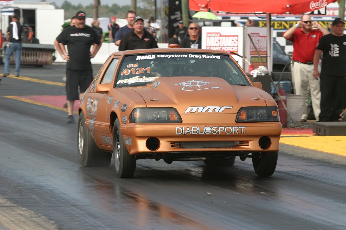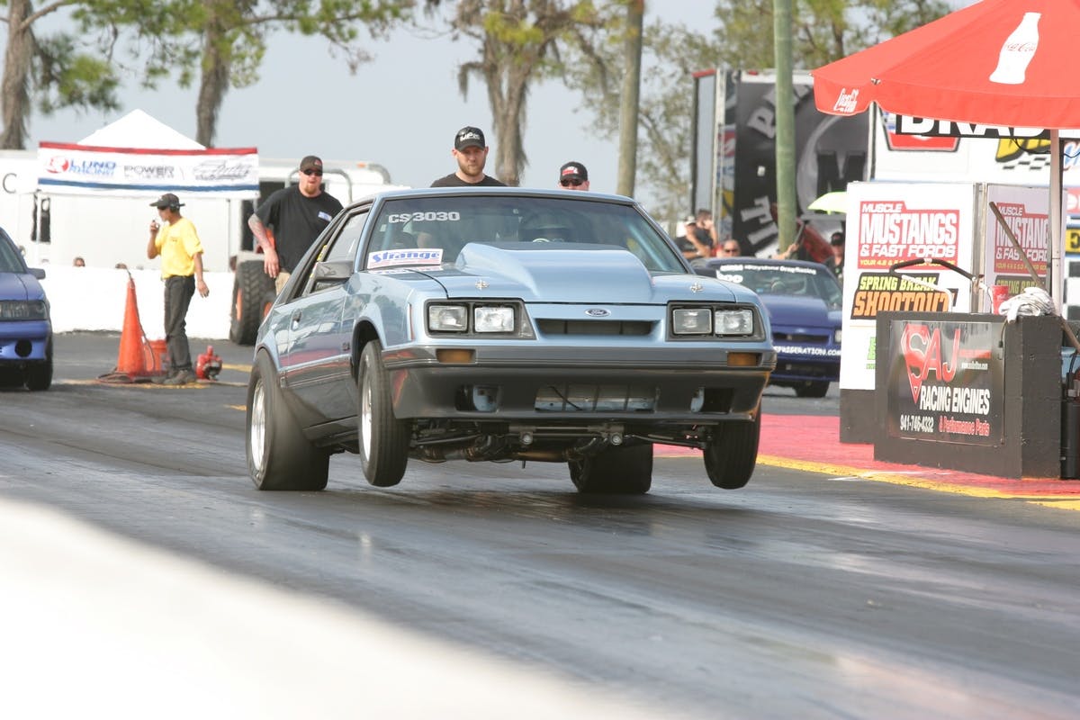 In Coyote Modified, Johnny Lightning was the only racer capable of beating a member of the Hellion 3. Lightning’s Cobra Jet was able to nose out Haley James with an 8.28 over James’ 8.29. Lightning had a better reaction time than James, which helped keep him out front for the win. In an NMRA first, Lightning also won the Truck class at Bradenton. He is the first NMRA competitor to win two classes at the same event. Well done, sir.In Pure Street, it was the Teddy Weaver show, again. Weaver has the suspension sorted out pretty well on his car, while it seemed final round opponent Jimmy Wilson is still looking for the sweet spot. Wilson has the horsepower, you can see that, so once he gets the suspension set-up down, he could really give Weaver some stiff competition.Steve Gifford picked up where he left off in 2014 when he closed out the NMRA season with a Coyote Stock win at the World Finals. Gifford was able to do some testing at Bradenton leading up to the event, and he put that testing to good use. His times were a little inconsistent, but quick when it counted in the semi-final against Joe Marini and the final round against Michael Washington.The Coyote -swap cars in Factory Stock still have to get through Matt Amrine’s little Two-Valve. Amrine won Factory Stock over James Meredith with a 10.73 vs a 10.86.This is why you race on Sunday; you never know what can happen on the track during any given run. Case in point, Adam Kuffel didn’t have the fastest car in the Spring Break Shootout class, but when the smoke cleared, his ’85 GT with a 363-inch combination was the last man racing. Kuffel’s Four-Eye is capable of high-8s, and that’s what he used to win the class.One class that appeared to be a foregone conclusion was the Turbo Coyote Shootout. If Bradenton was any indication, it does appear JPC Racing runs the Coyote game. Justin Burcham simply dominated the class from start to finish. No one else was even close. Though we greatly respect Joey Basile’s 8-second runs on 20s, Burcham owned the class on this weekend.In the VMP Tuning Terminator GT500 shootout, the class was dominated by the Terminators. A few of the GT500 players have moved over to heads-up categories, which has left just a few GT500s to battle the ’03-’04 Cobra crowd. Scott Waters and Shane Halleman were the class’ heavy hitters, and both pilot Terminators. Waters had issues on Sunday, and Halleman took it from there, running 8s seemingly at will, even during the heat of the day.In the Tremec Stick Shift Shootout, Anthony Heard was able to successfully defend his title. Heard’s Fox coupe has a naturally-aspirated 363-inch combination for power, and he was able to drive his way to victory over Jeff Scofield. Heard was ready when the tree came down, unlike Scofield. Heard won thanks to a huge starting line advantage, and was able to stay out front, even though Scofield ran four-tenths quicker.
