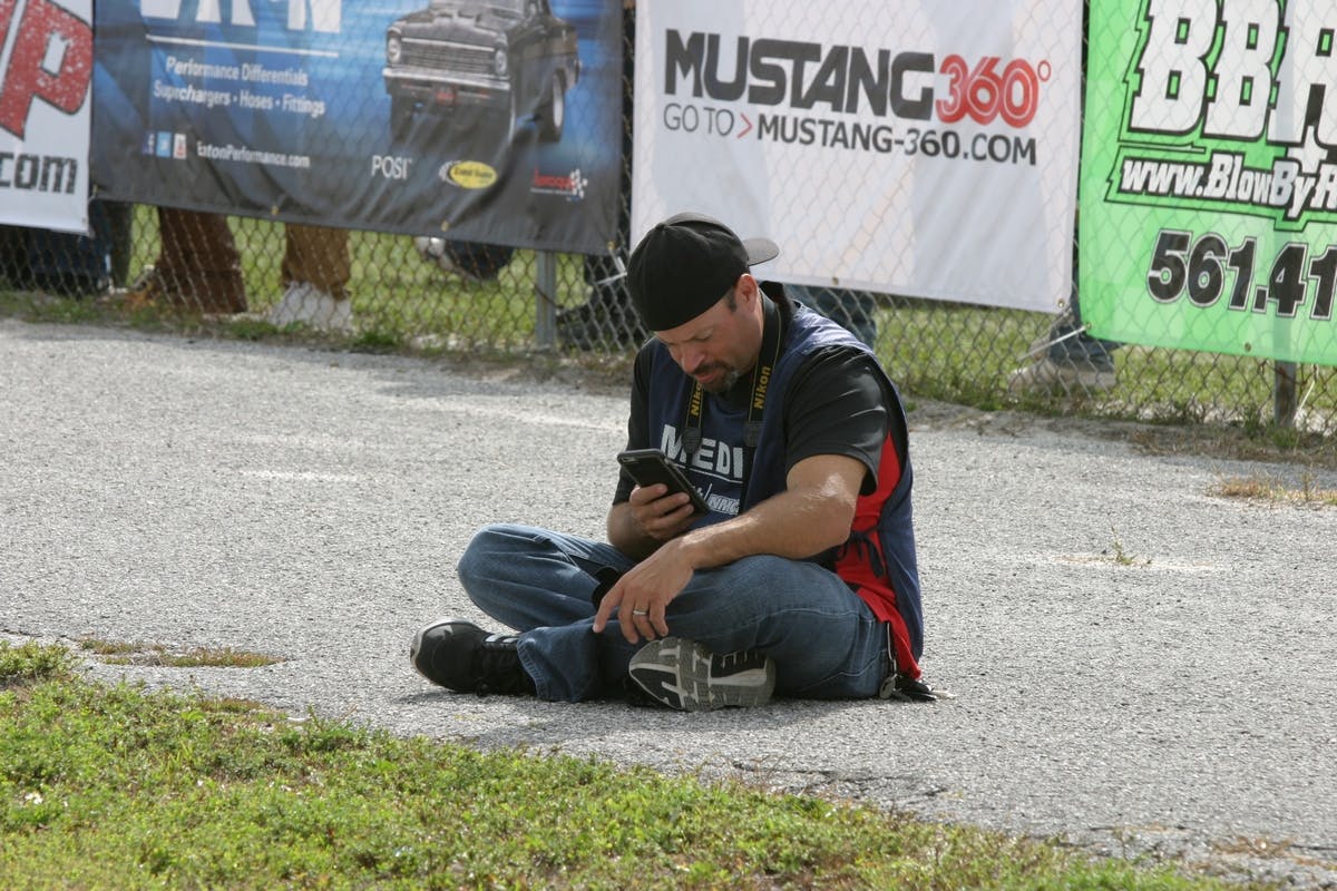 John Leslie Jr was chatting with Joe Charles and crew in the lanes before a test and tune pass. Leslie is loving his Factory Stock ride’s new Coyote powerplant.Matthew Laszaic brought his Cobra to run in True Street. The Cobra has a ton of miles, and it seems Laszaic is trying to shorten the engine’s life span by sprayin’ it with a good dose of nitrous. So far we’ve seen Laszaic run a few low-13s, but he was able to coax a 12.85 out of the car after a bit of coaching.Shiftin’ Shane Stymiest has gone Hollywood on us. He sits in the car while his girlfriend Bobbi Jo Rector checks air pressure.Haley James is making a big splash in Coyote Modified at Bradenton. She started out with an 8.30 pass, but during today’s hot test and tune she blew the tires off. The crew had to make some rear suspension adjustments to the car before that pass, but the track wasn’t holding it.The 2014 Tremec Stick Shift Shootout champion Anthony Heard is back to defend his title. Heard had to do some work to the car leading up to the race, and though he made a 9.96 pass earlier in the day, he spun out of the hole during the heat of the day.