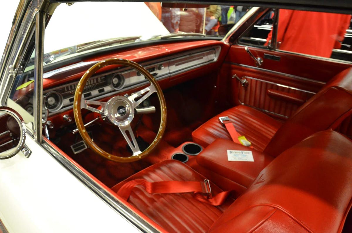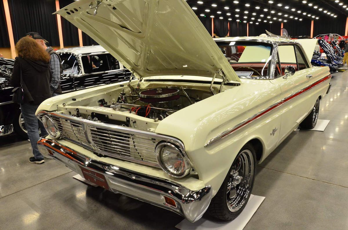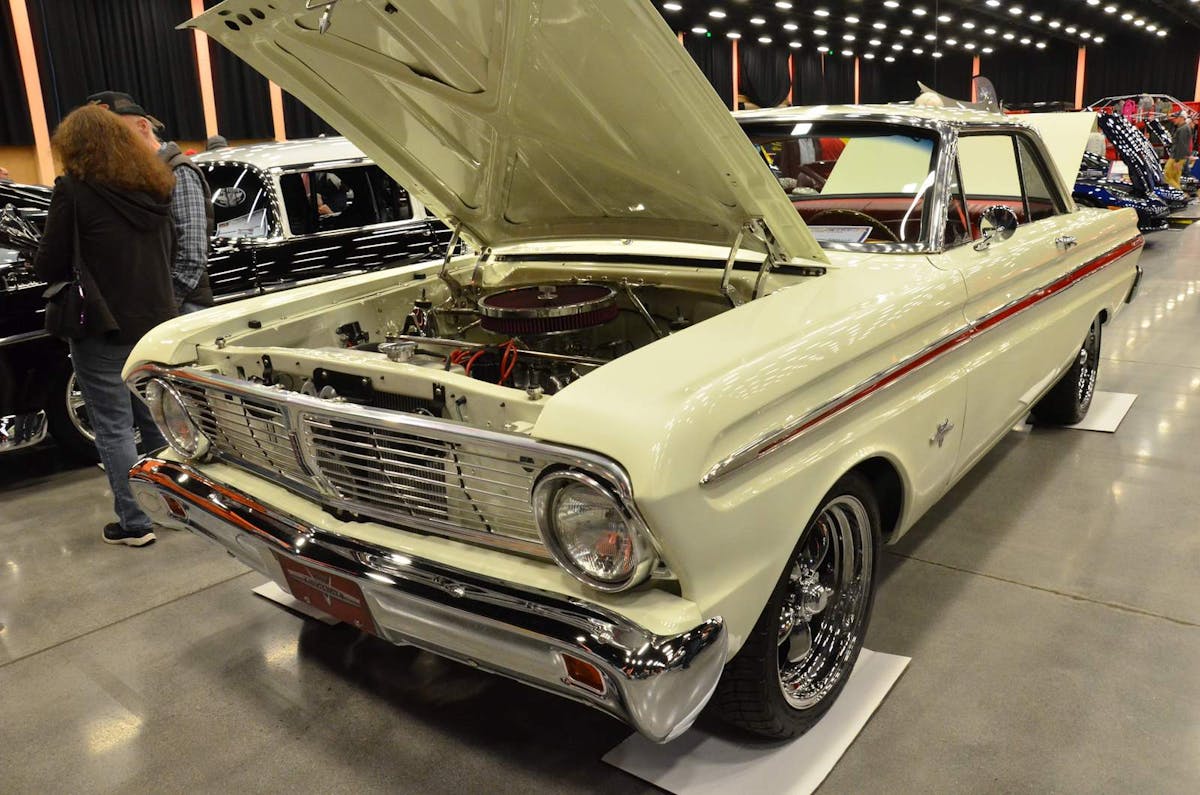 Kevin Pollard’s 1964 Ford Falcon offers a great mix of original with just a few modern touches, creating one slick ride. Painted in a classic shade of white and decked out with red trim and plenty of chrome, the car appears stock from 10 feet. A closer look reveals a set of more modern, but period-correct Torque Thrust-style wheels and some nice subtle chrome under the hood. The real highlight of this car, however, is the beautiful red interior. A set of low-back-but-modern bucket seats and a center console keep the driver comfortable and in place, while modernized wood grain steering wheel keeps the driver in control.If we could have bestowed a Ford Best Of Show award, Terry Pollard’s stunning 1956 Ford F100 would have earned it. Painted in a gray and orange two-tone divided by a subtle blue stripe, this F100 is easy on the eyes, yet flashy enough to grab your attention from across the room. Sitting on a set of Chip Foose wheels, the truck also has just the right stance to it. Under the forward-tilt hood, Terry’s truck is all-Ford, gorgeously dressed out in vintage style Edelbrock attire. Meanwhile, beautifully covered bucket seats and a custom built full center console finish off this awesome build. Even the Corvette Expo couldn’t resist putting this beauty up in the front row.