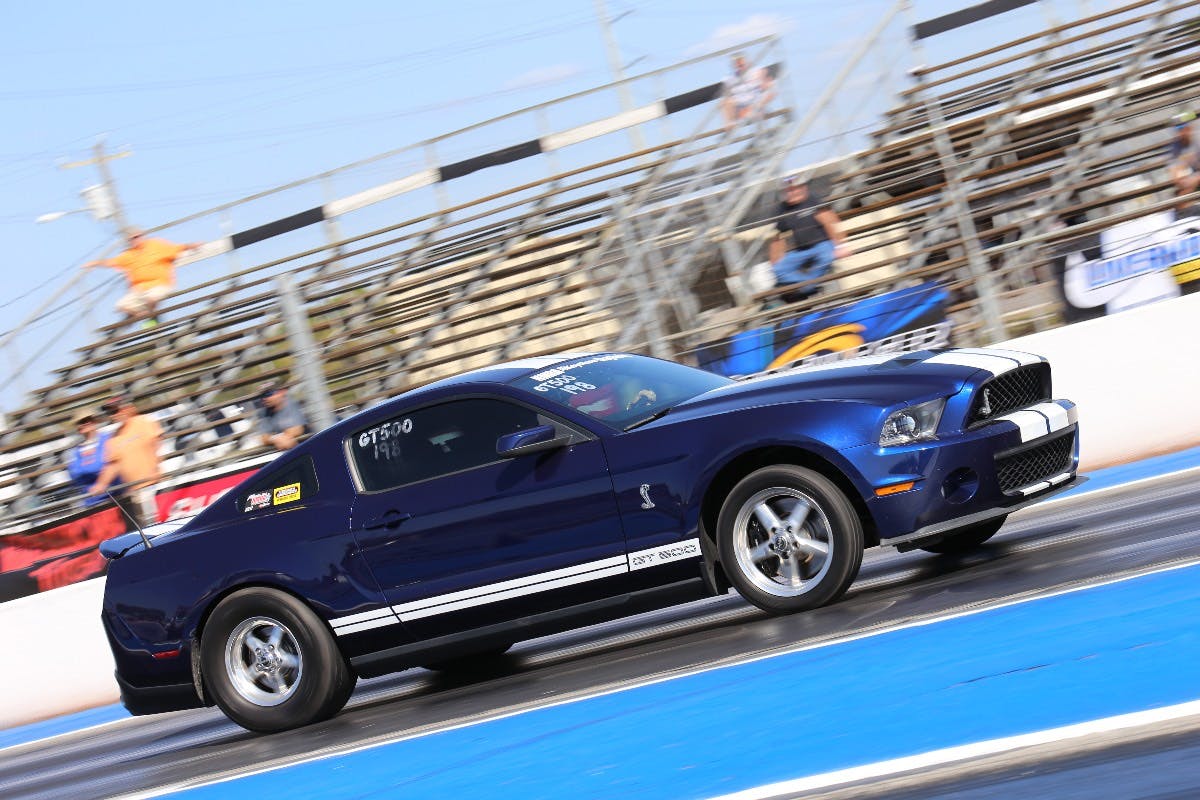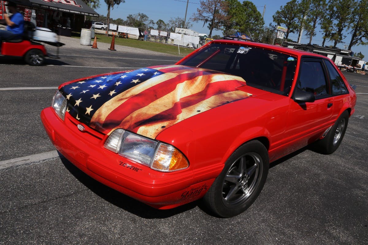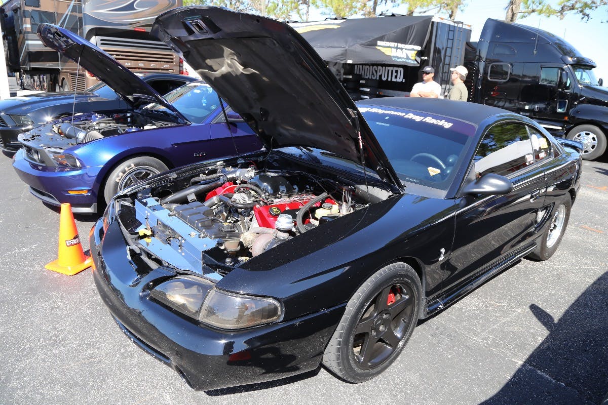 There are 14 Cobra Jets on the property at Bradenton making for one of the most entertaining classes around. These Ford Performance-prepped racers still yank the front tires while flying down the track and make all the right noises while doing so. This specialty class is into eliminations today, so the top of the CJ heap will soon be decided. Be sure to catch all the action live over on SpeedVideo. Coyote Stock racer Carlos Sobrino knows what’s up. He generously added a Ford Muscle sticker to his race car, The Joker. We all know stickers make cars go faster, so look out for Carlos to improve on his car’s e.t.’s with this new addition. He is still adjusting to his Fox being at full CS-legal weight after running light and in the nines a the World Cup Finals.John Leslie Jr. put the Factory Stock field on notice with a 10.56 at 125 mph in the first round of qualifying last night and he actually improved on that pass with a 10.51 at 125 mph rip in the heat. Having even a tenth advantage over the field is huge in this limited class.The energy level is high in Bradenton. The weather is beautiful, the spectators were lined up for miles this morning and the car show is just brimming with great cars.John Kauderer blasted off the quickest pass in Coyote Modified history to claim the top qualified spot with a clean 7.74 at 174.96 rip.After working 44 hours straight with no sleep to revamp his ride for the event, Justin Jordan showed up today and put his Hellion Turbo-boosted Mustang right to the top of the Turbo Coyote Shootout qualifying sheet with a 7.89 at 181 mph pass.BoostedGT took and easy win in his afternoon matchup with Bobby Ducote, whose Fox was still having issues.