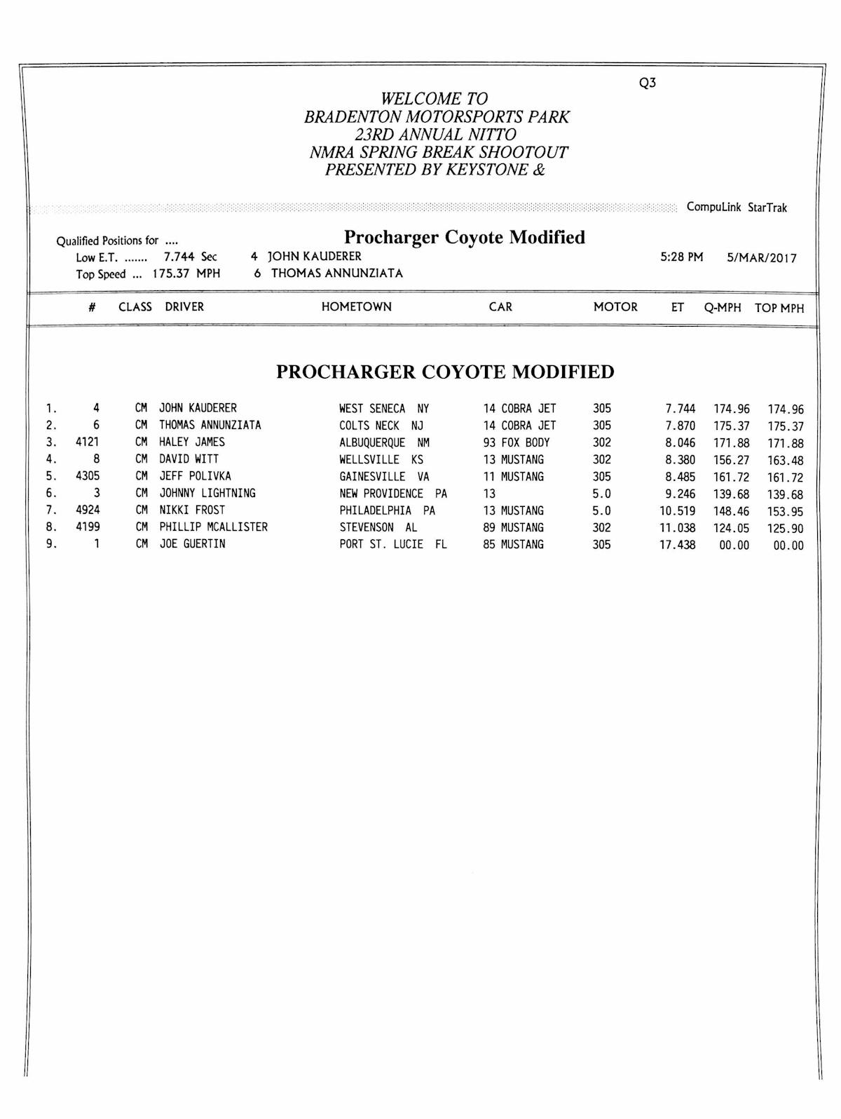 Coyote Modified: John Kauderer, 7.74 at 174.96 mph
