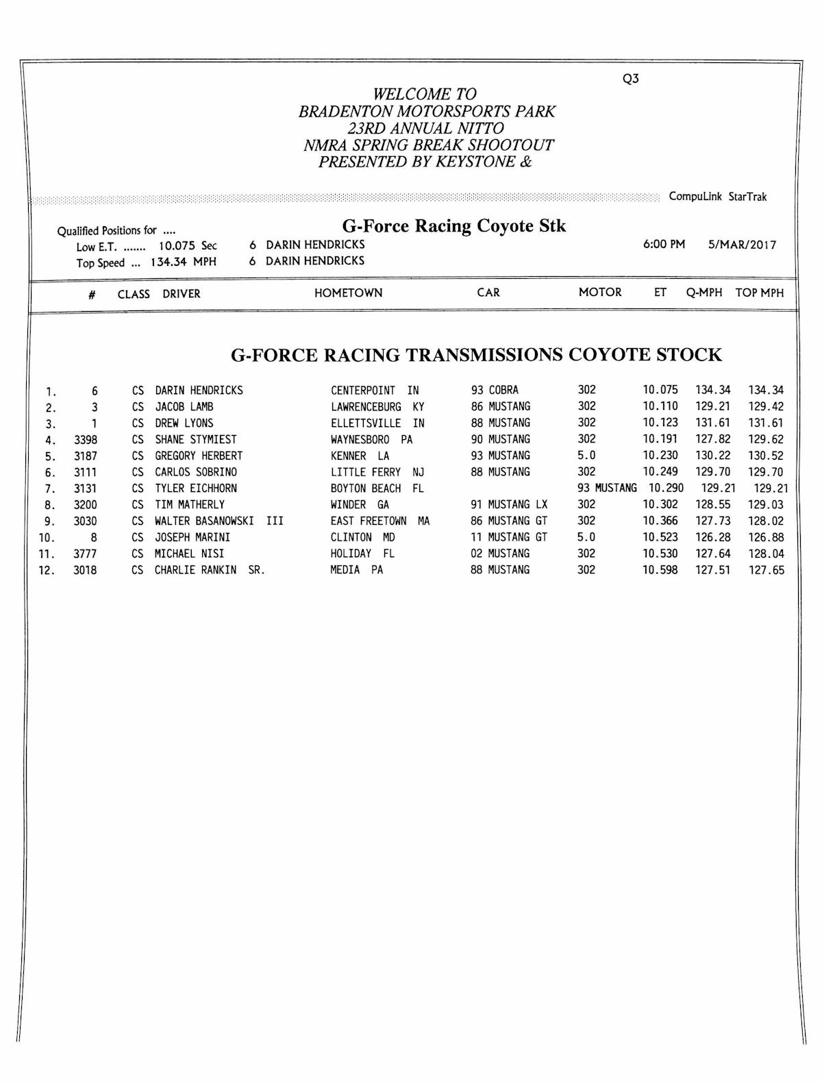 Coyote Stock: Darin Hendricks, 10.07 at 134.34 mph