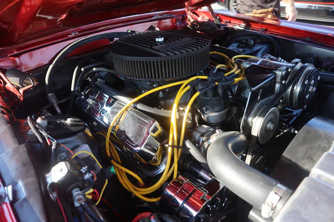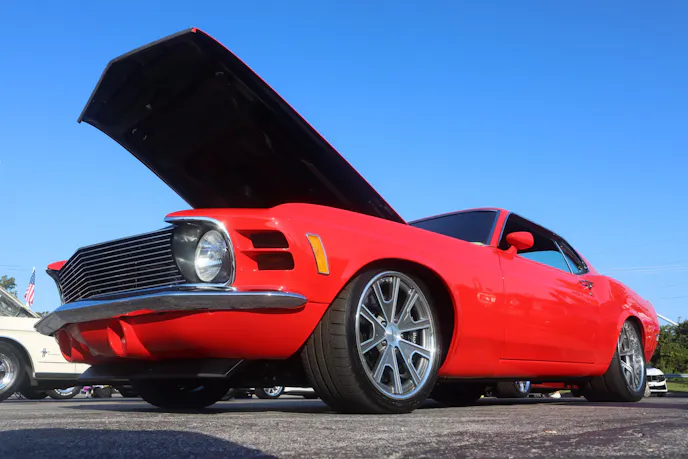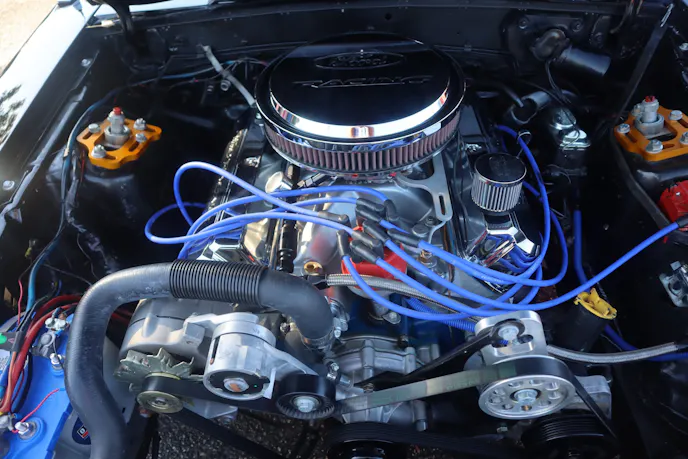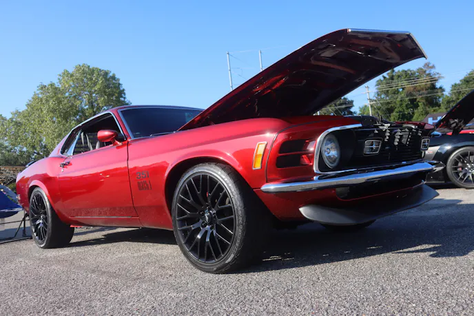 Buffy Poole’s 1970 Mach 1 is a mild street build powered by a 351 Windsor with aluminum heads, a mild cam, and Holley Sniper EFI. However, it was the striking tri-stage paint lifted from a late-model Mazda that grabbed our attention. Then we noticed the S550 Performance Pack wheels and how great they look on this classic. Rolling on those rims is enabled by an Anthony Jones Engineering K-member that makes use of SN-95 front suspension. In all, it is a sharp street stallion.