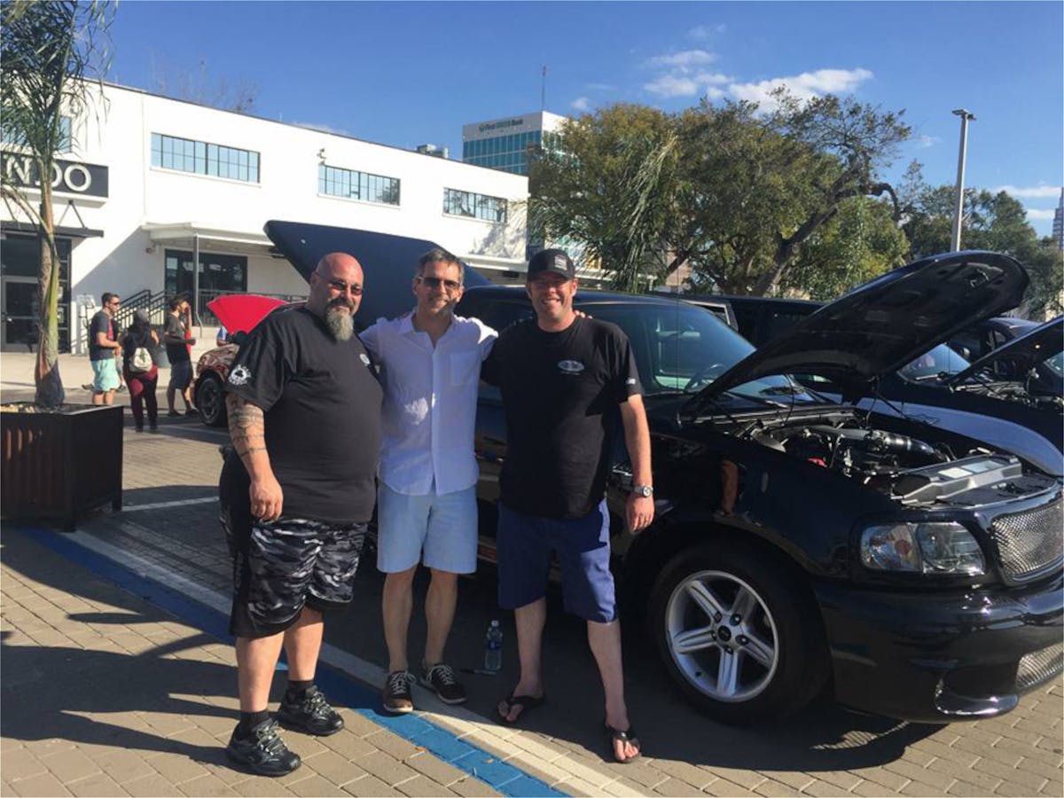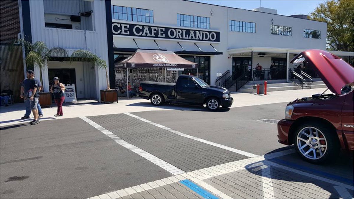 An impressive group of Lightning trucks plus their owners and fans of the SVT truck gathered at the Ace Café in Orlando, Florida, for the annual Southeastern Lightning Meet on February 17, 2018. (Photo Credit: Southeastern Lightning and Harley Club)