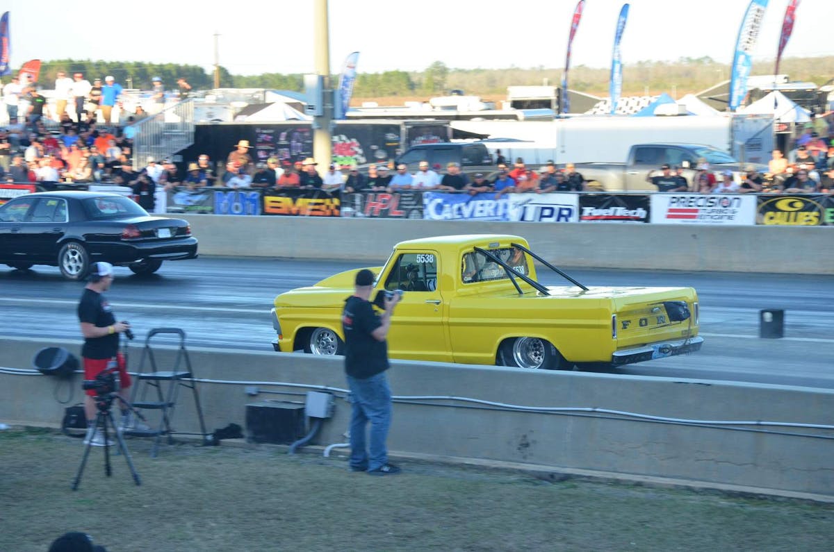 The old saying it is hard to judge a book by its cover often applies to drag racing cars and trucks. When we first checked out this yellow F100 early Friday morning, we had no idea how it would perform on track. Well, the big-block-powered Ford truck did not let us down. It delivered a nice, wheels-up launch for our camera.