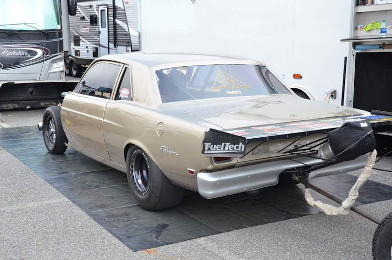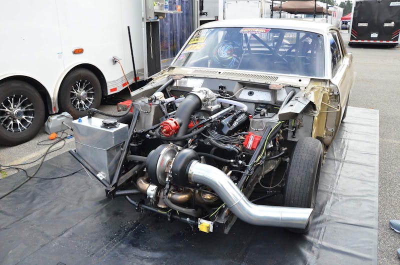 When we first walked up on Tim Fladd’s 1990 Ford Mustang on Friday, he was warming the car for its first pass of the day. That is when we first noticed something a little different about the car. Instead of the traditional race mufflers or open headers we had been used to hearing, this car still maintained a factory-style tailpipes.