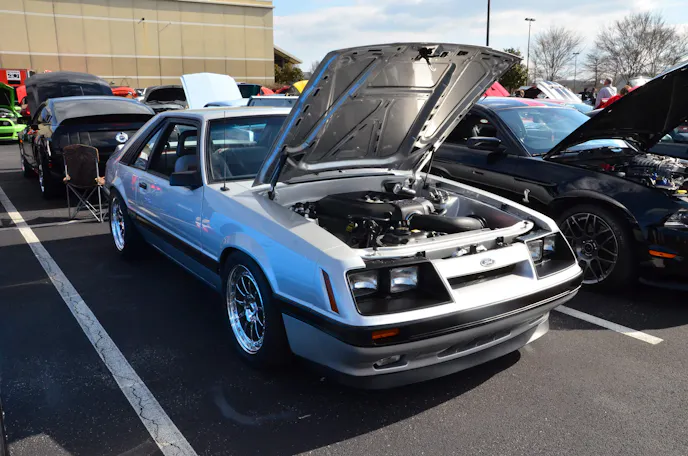 Jamey Mattingly’s 1986 Coyote-swapped GT was one of the highlights of the outside car show. Clean and well executed, the car took home Best 1979-1986 in the outdoor car show. Other than the obvious 5.0L Coyote, the exterior of the car appeared mostly stock other than a few subtle upgrades including wheels and some aftermarket gauges. It might have been the Tennessee sunlight, but the car appeared to be a shade lighter than the factory most silvers we are accustom to seeing, giving the car almost a white hue which really grabbed your attention.