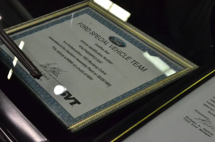 Brandon Clontz is known for quite an impressive collection of Fox-bodies including a pristine low-mile 1993 Cobra and a 1992 Cobra R Prototype, both of which our regular readers probably remember here on Ford Muscle. Brandon had four of his beautiful Foxes on display at Ponies In The Smokies, but the most unique one had to be this teal 1993 Cobra. The car wears number 4993, making it the very last 1993 Cobra to roll of the assembly line. With the documentation and letters from Ford to back it up, this Cobra has to be one of the most collectible of all the 1993’s.
