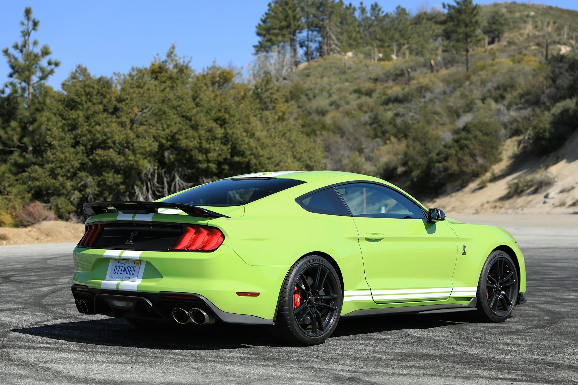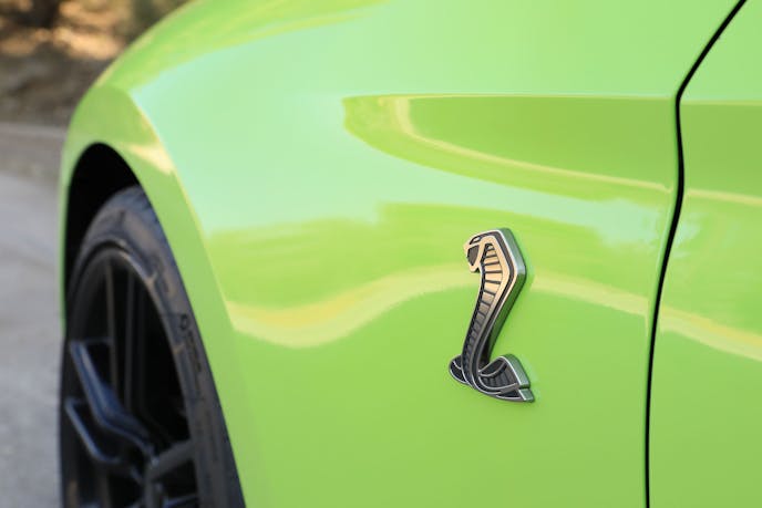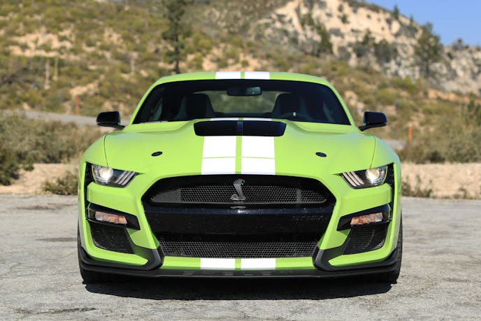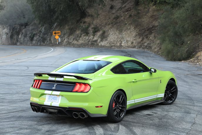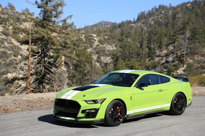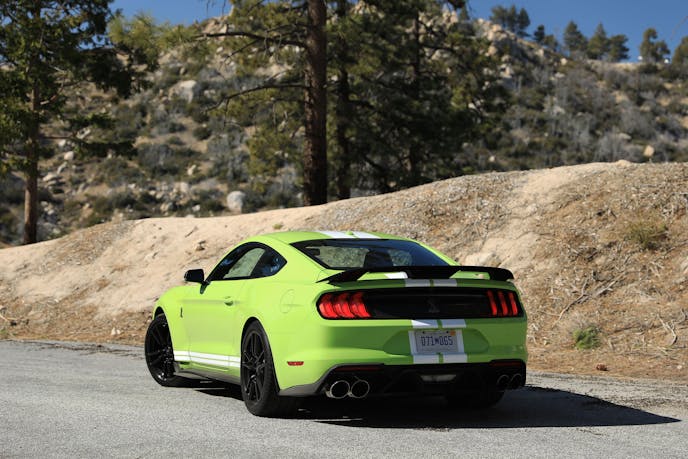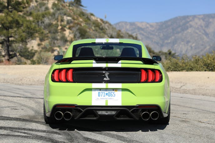 More was revealed during our stints on the winding tarmac of the Angeles National Forest. Though it’s certainly capable of holding its own on a mountain road, up there it’s a noticeably less engaging affair than its naturally aspirated Shelby brethren are, owed in part to the additional weight up front as well as the lack of physical involvement offered by a manual gearbox.