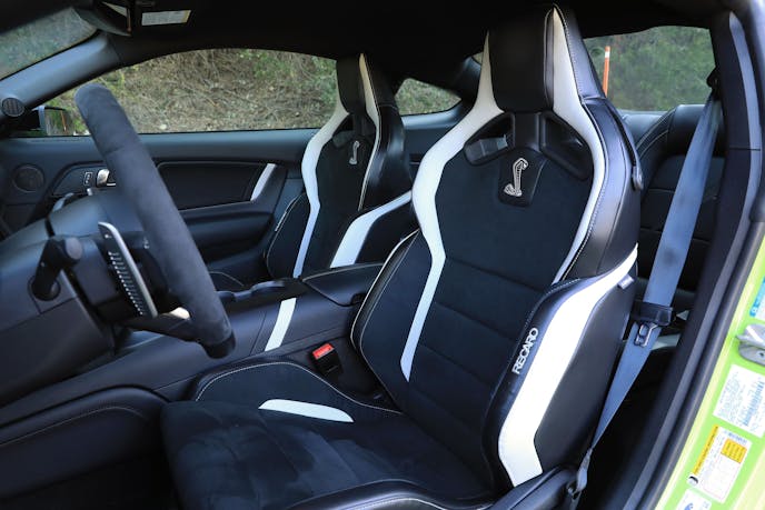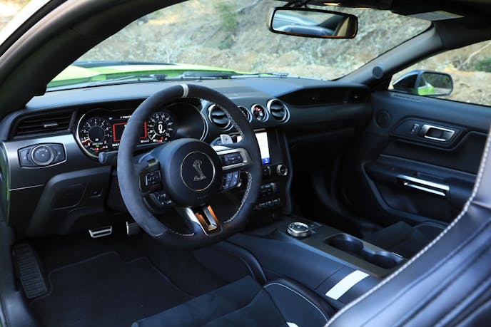 Venturing out onto LA’s busy, pock-marked streets quickly reveals some clear distinctions between the GT500 and the GT350R we spent time with a few years back. The latter’s track-tuned suspension and wide Michelin Pilot Sport Cup 2 tires paid dividends on a good mountain road, but the car’s brittle ride quality and eagerness to tramline quickly wore on our nerves during normal driving.