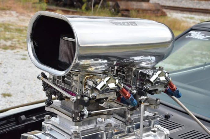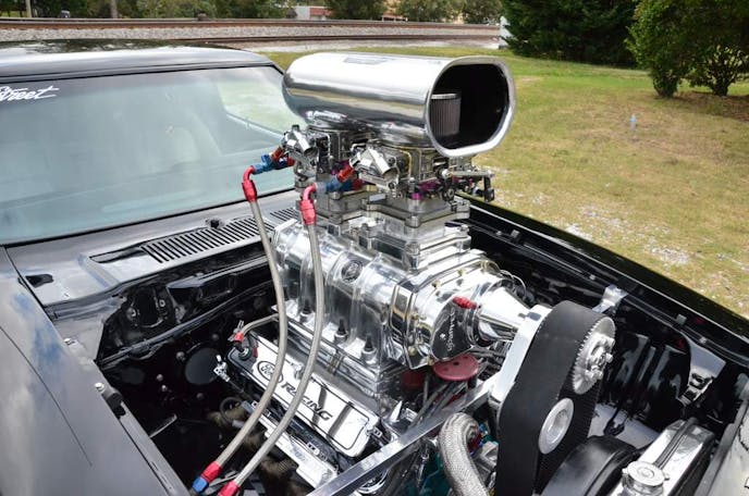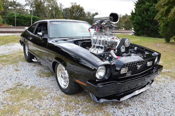 Close your eyes for a moment, now, picture a sleek black Ford Mustang sitting there. Imagine a huge, polished 671 blower with dual quads sticking out the hood. Imagine a classic 33-inch Mickey Thompson drag radial shoved under the tubed back fenders.