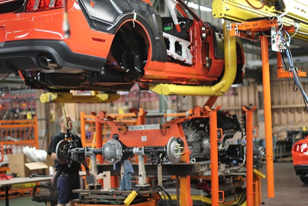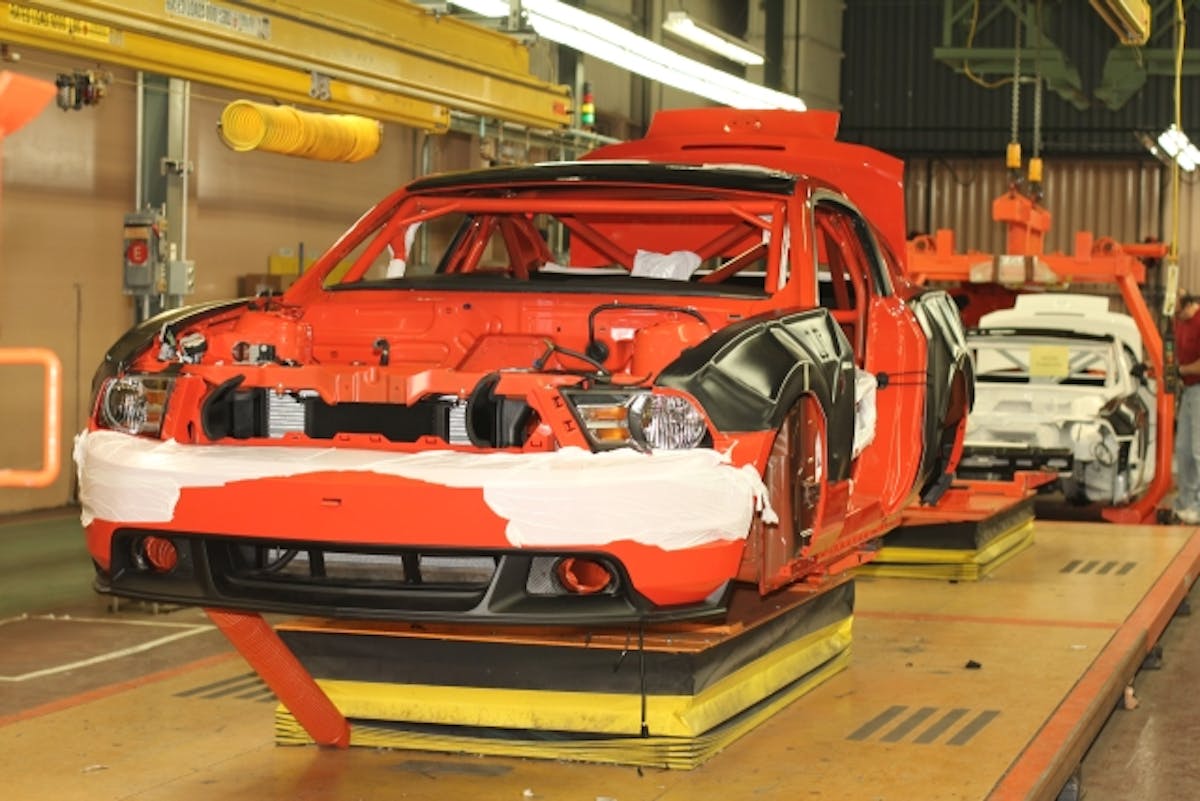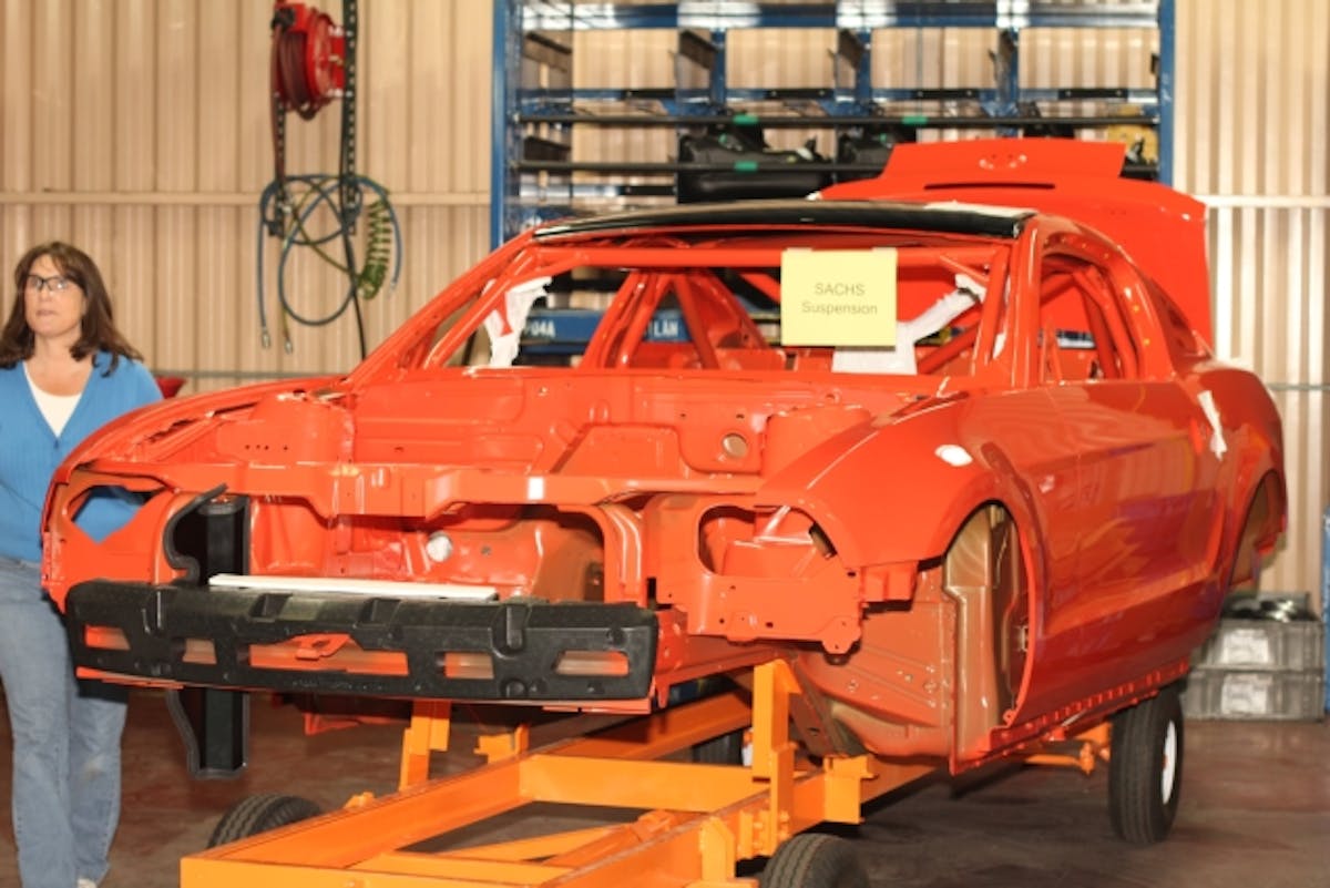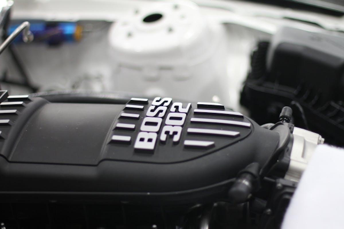 The BOSS 302S starts as a Mustang body-in-white. To reduce weight, the factory seam sealer, sound deadener and interior panels are deleted prior to body build. The body in white is sent to a local company, Wilson Engineering, to have a 6-point FIA-legal roll cage installed for driver safety and chassis rigidity. A number of additional changes are made before returning the bodies to the Auto Alliance plant, where the cars are then painted in either Performance White or eye-searing orange.