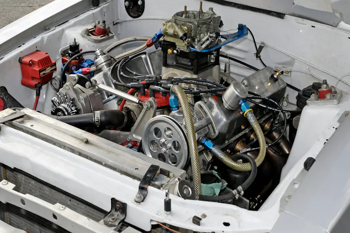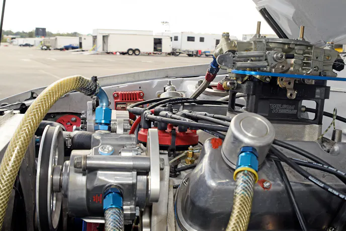Power is provided by a Bennett Racing Engines crate 434 ci naturally aspirated small-block Ford engine. They used Trick Flow ported heads and a Ken Jones 950 Holley-based alcohol carburetor. Additional components include a GZ Motorsports vacuum pump, Kooks Headers and Exhaust custom headers, Holley Performance/MSD Digital 7 Ignition, and a Meziere Enterprises electric water pump.