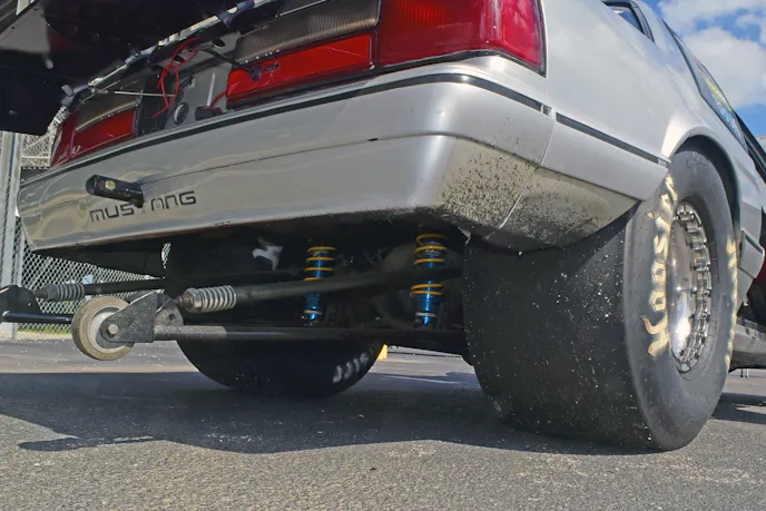 Byron purchased the Mustang as a rolling chassis but has added many of his own touches. “I bought the basic chassis from a buddy of mine who was a secondhand owner as well. This history is not completely clear, but it is a well-made car. We put in a funny car cage, did quite a bit of detail work, and reworked the front end with QA1 front suspension components.”