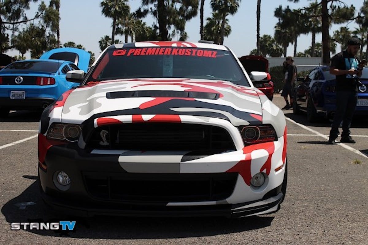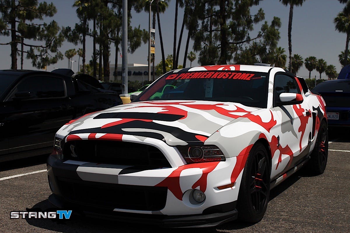 It seems however, that GT500s are everywhere. So how do you set yours apart? If you’re Anthony Cervantez you camo-wrap it. Cevantez owns a business that wraps cars and performs other services. We caught up with him at the Fab Fords Forever show at Knotts Berry farm a few weeks ago and had to check out his unusual looking GT500.