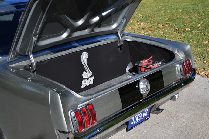 With the drivetrain dialed in it was time to concentrate on the rest of the build. A Ford 9-inch, Ididit steering column, Autometer gauges, 13-inch Wilwood Engineering Brakes, American Racing Torque thrust wheels were all installed. Tommy then kept the theme by going with a pair of fully powered 2003 Cobra front seats into the car. All of the wiring was tucked. A Vintage Air system was installed. The ECU to run the modular motor was hidden under the dash. A custom heat exchanger was installed to the front of the car with a modified Shelby lower valance to keep the supercharger cool.